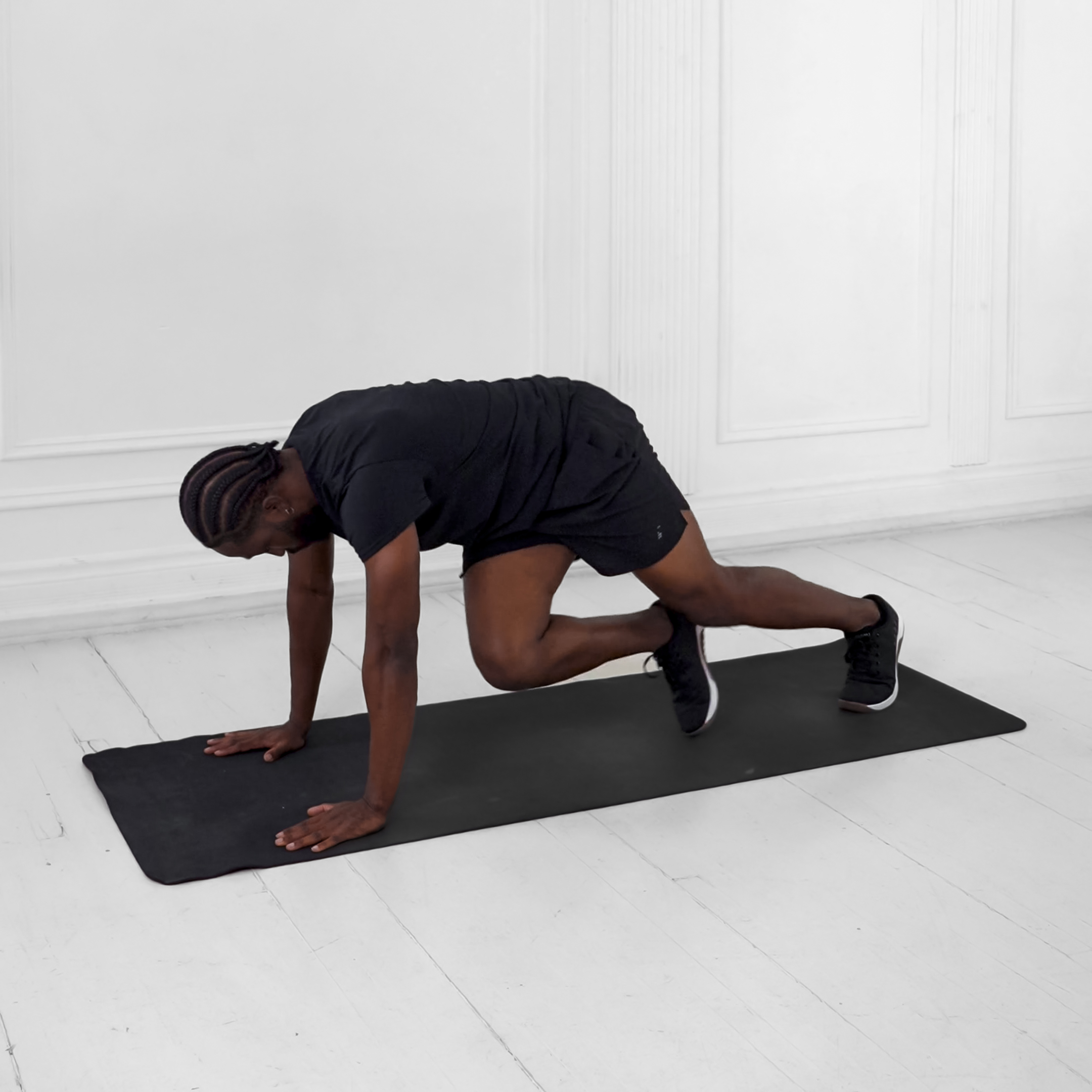 Exhale as you drive knee forward; inhale during leg switch.