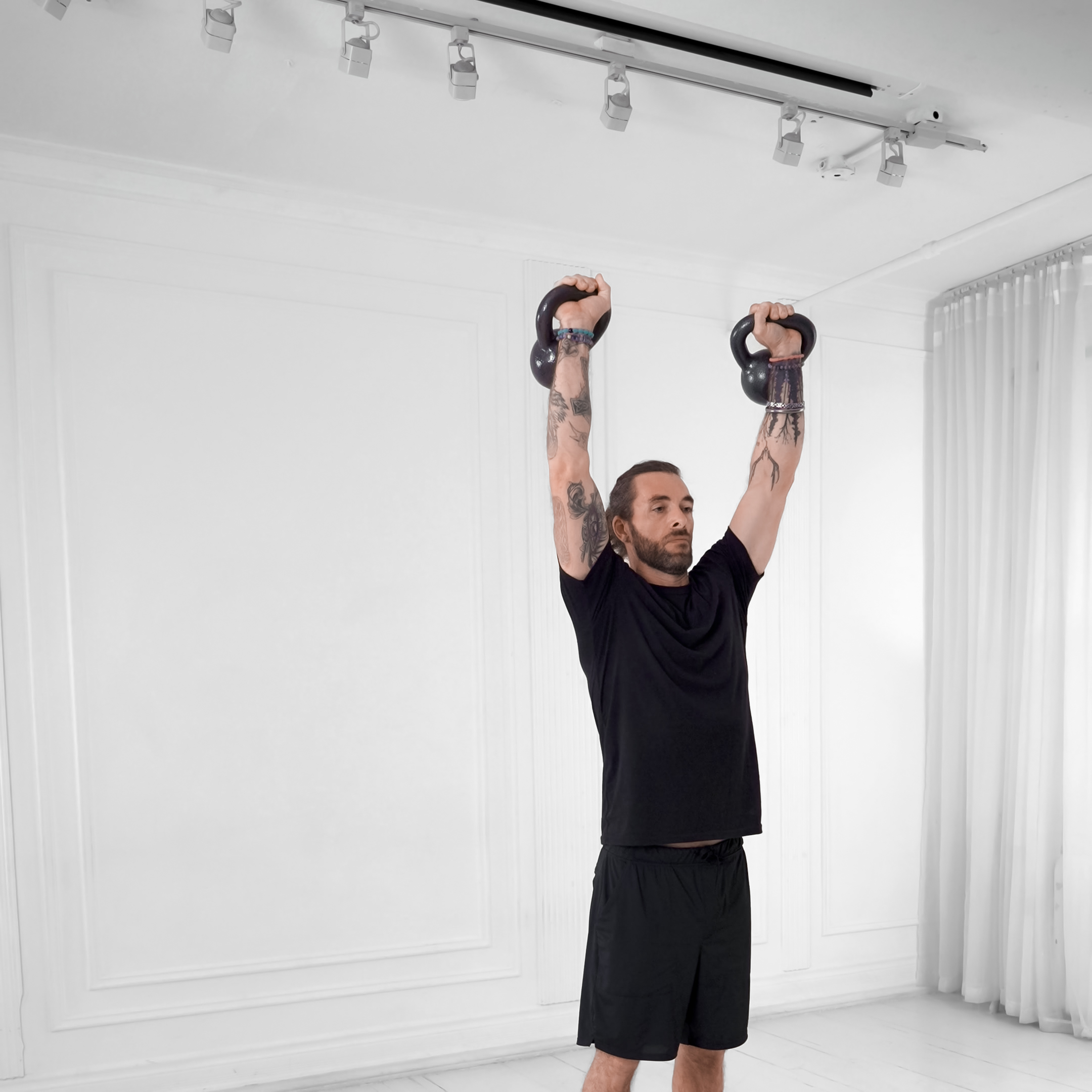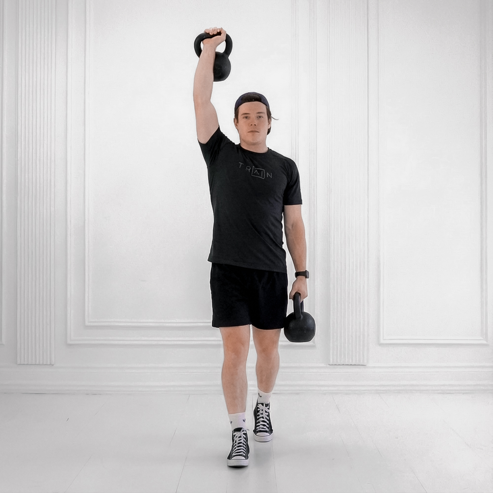 Lie on your side in a fetal position with the kettlebell gripped in the lower hand, handle diagonal across palm. Roll to supine and press kettlebell overhead with arm locked, shoulder packed.
