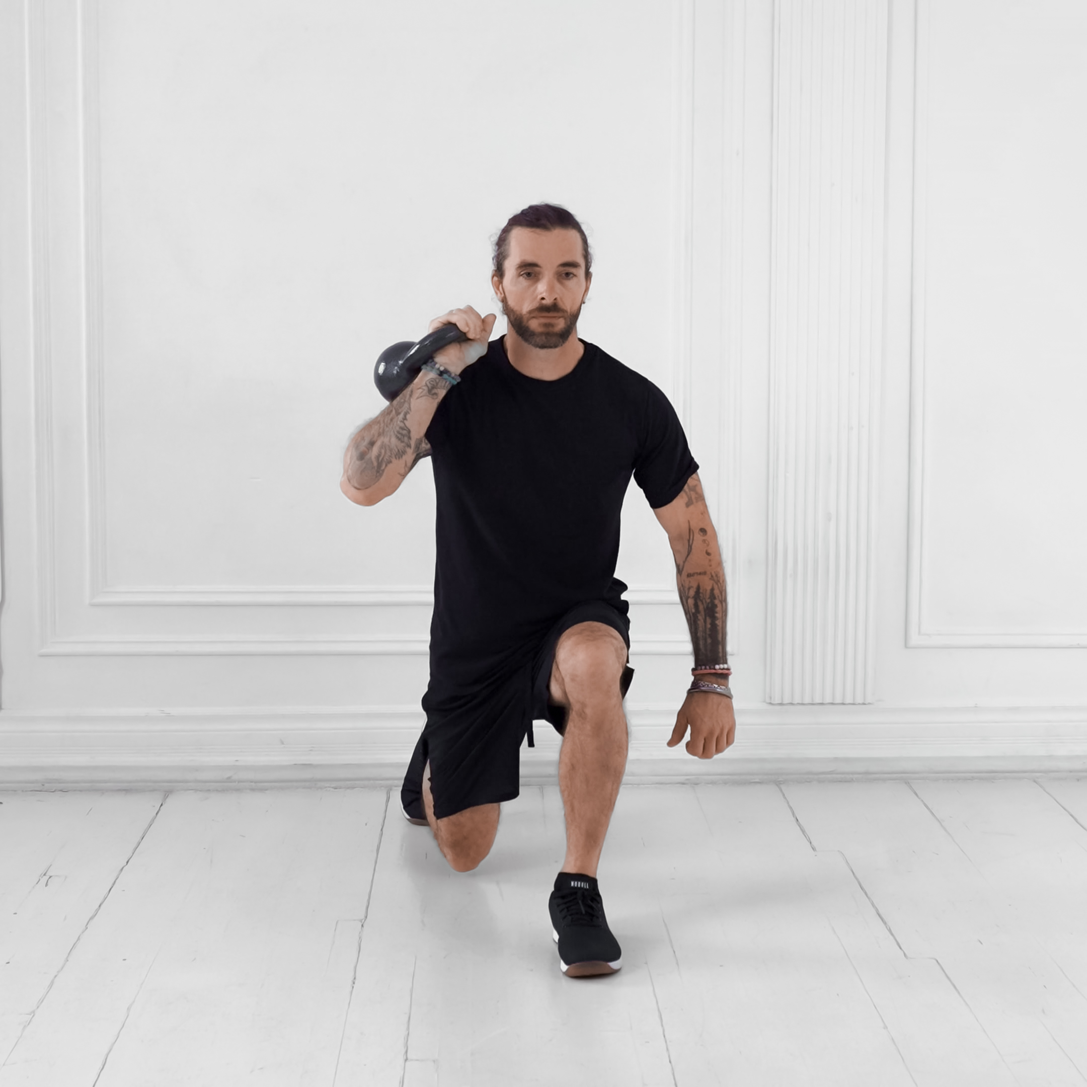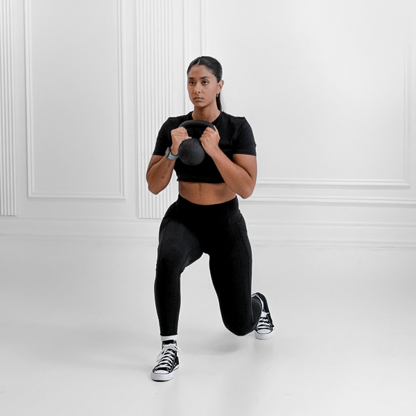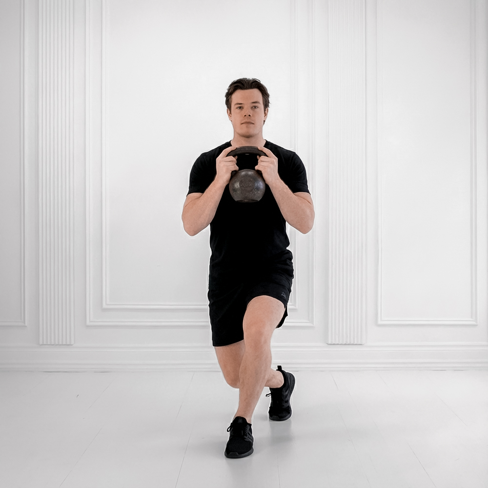 Stand with feet hip-width apart, holding a kettlebell in the hand opposite your starting lunge side, core engaged and spine neutral.