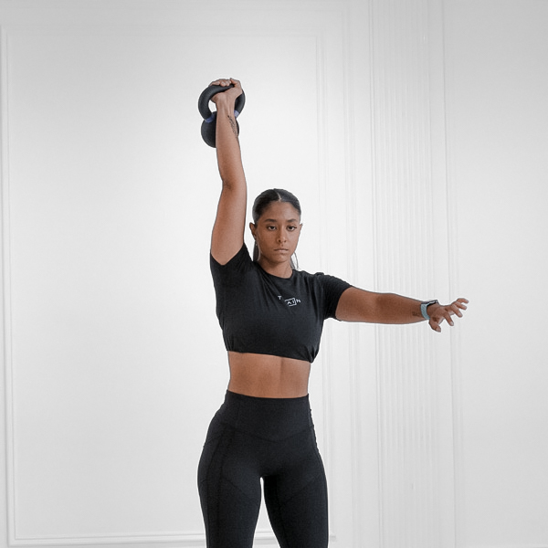 Explosive single-arm kettlebell snatch with split stance that targets shoulders, glutes, quads, and hamstrings to build power, agility, balance, and overhead stability.