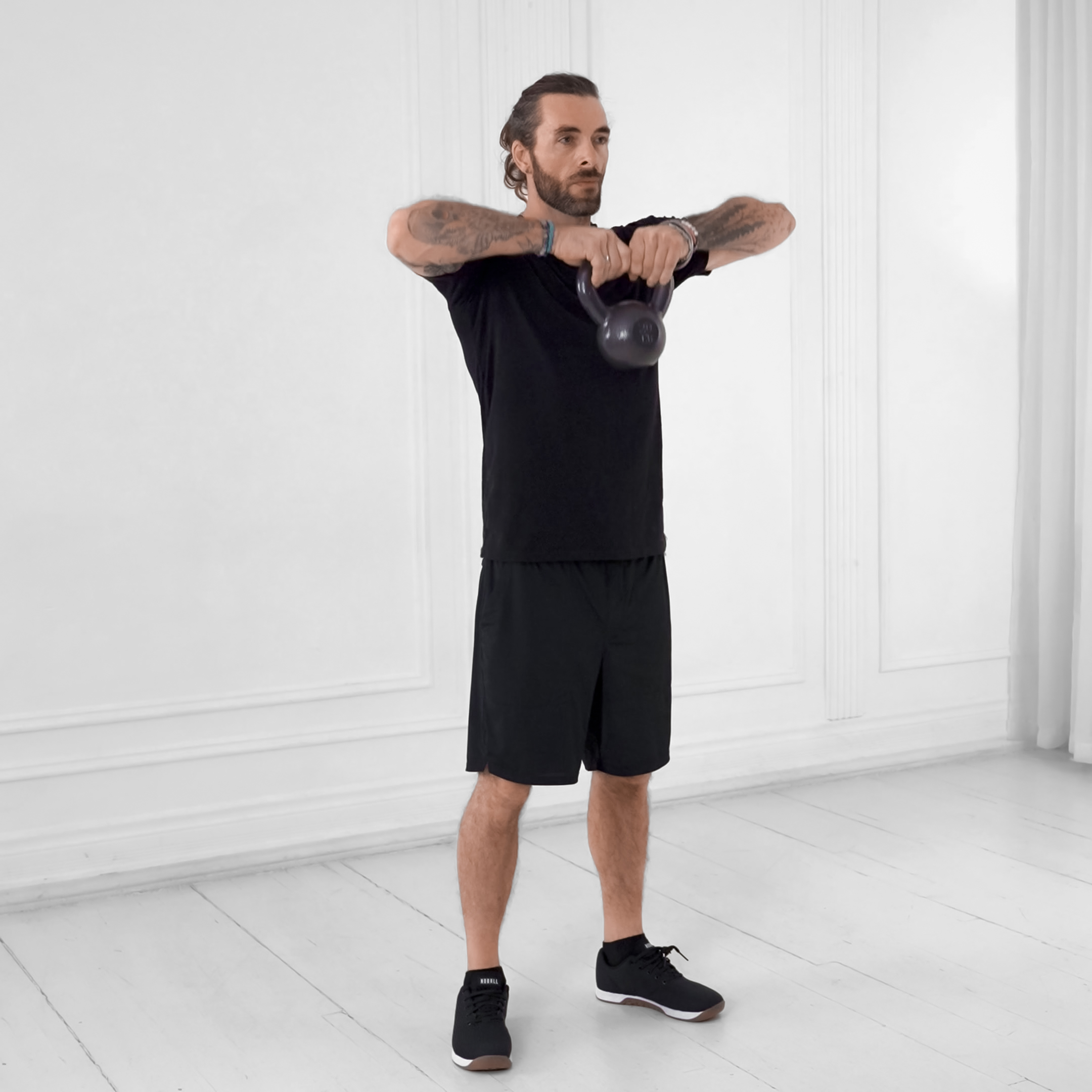 A compound full-body movement combining a squat with an upright row using one kettlebell, targeting quads, glutes, shoulders, and traps to build strength, endurance, and coordination.