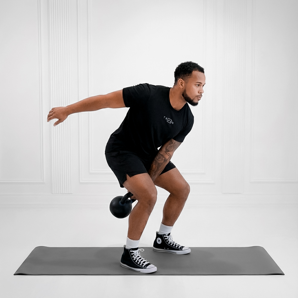 Dynamic full-body exercise combining explosive kettlebell swing with squat, targeting glutes, hamstrings, and quads for power, strength, and cardiovascular endurance; scaled by weight or reps.
