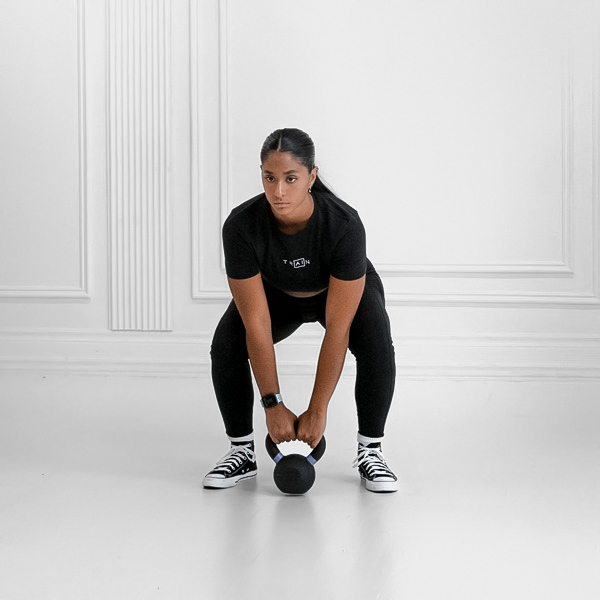 Place kettlebell on ground between feet shoulder-width apart. Hinge at hips with flat back and engaged core to grip handle with both hands.