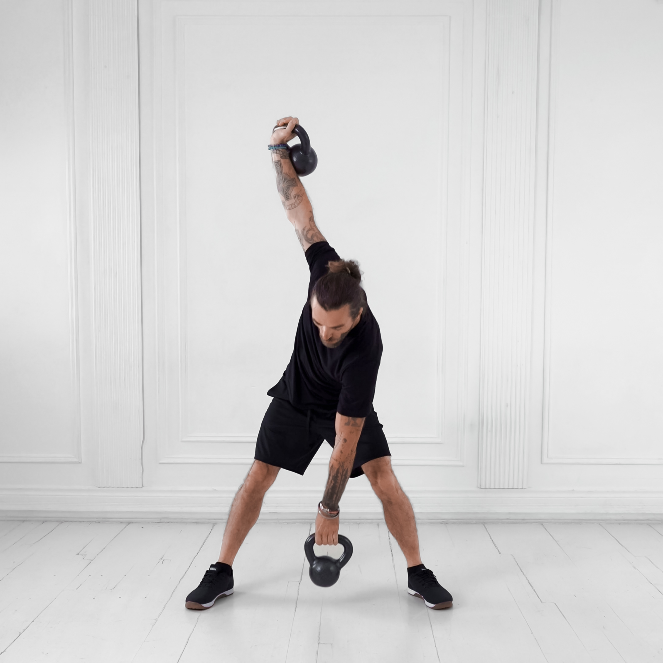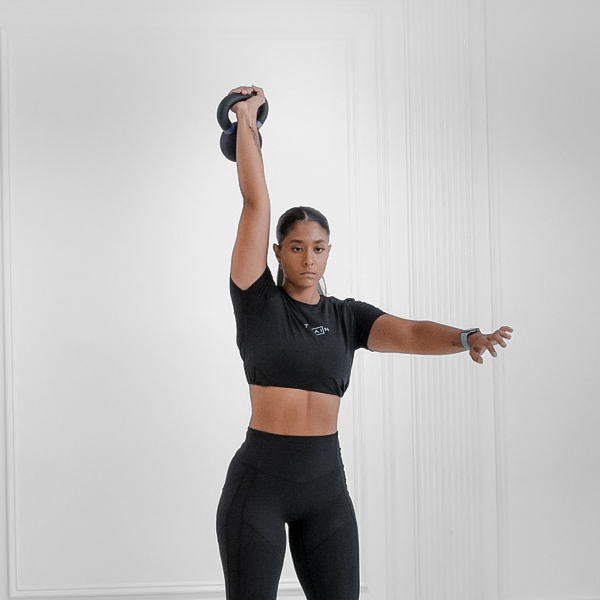 Kettlebell overhead hold combined with hip hinge and torso rotation to touch opposite toe, targeting obliques, glutes, and shoulders for core stability, strength, and hip mobility.