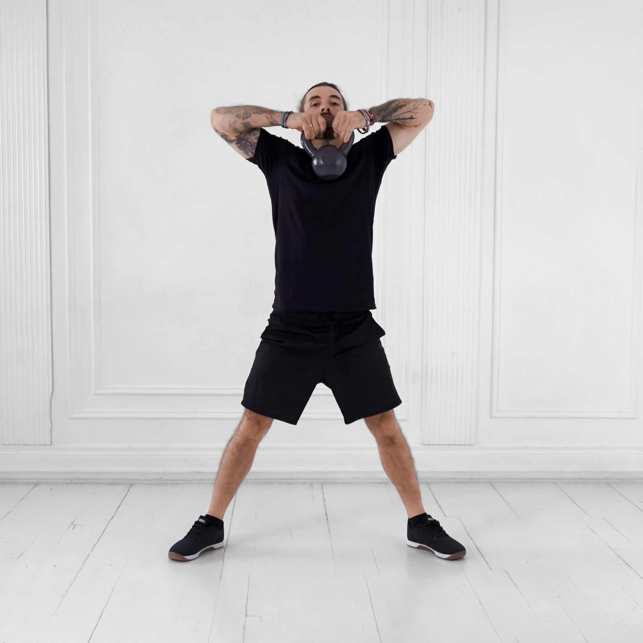 Stand with feet wider than shoulder-width, toes turned 45 degrees away from the loaded side. Press kettlebell overhead with one arm locked, gaze fixed on it.