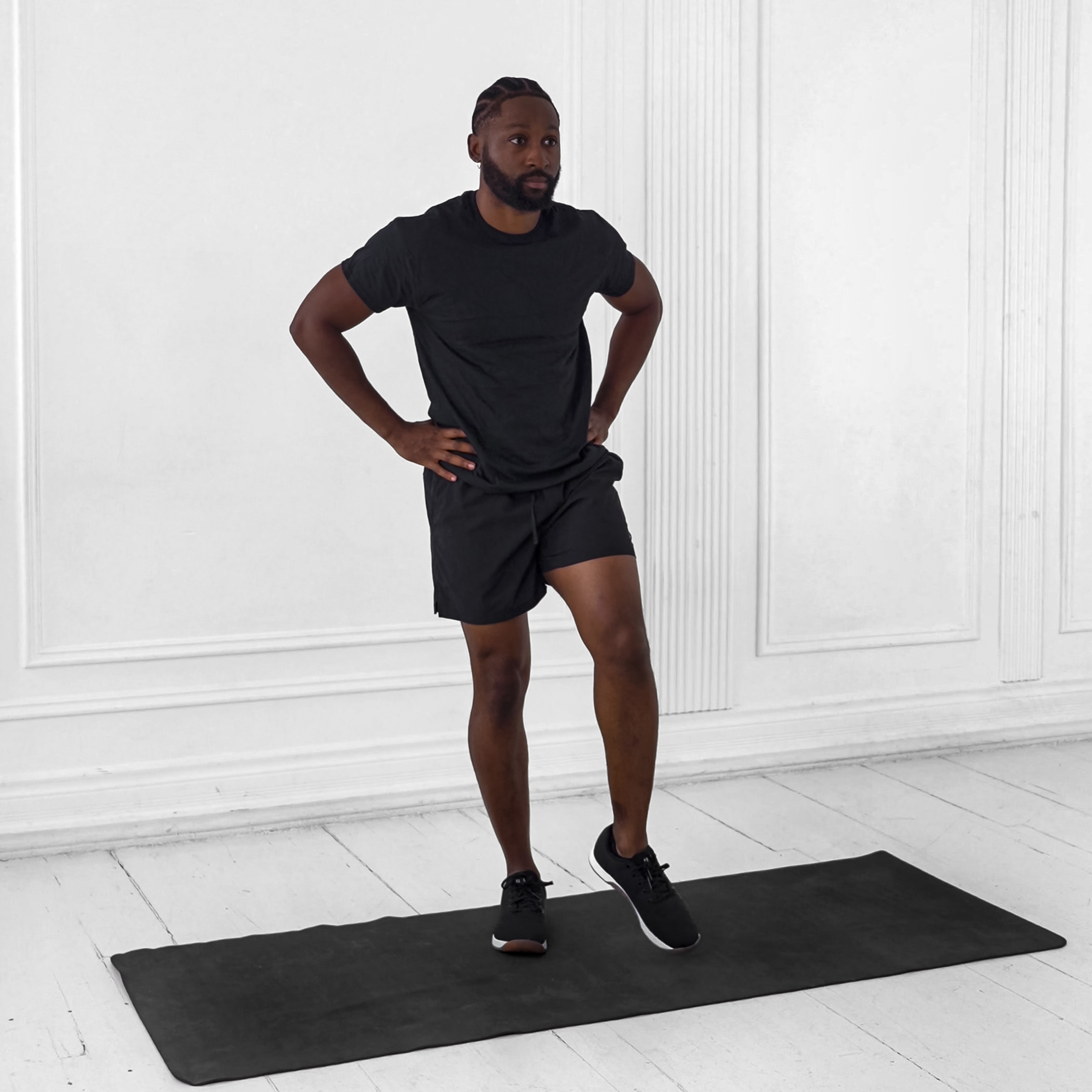 Stand upright with feet together, knees slightly bent. Place hands on knees for guidance, maintain tall spine.