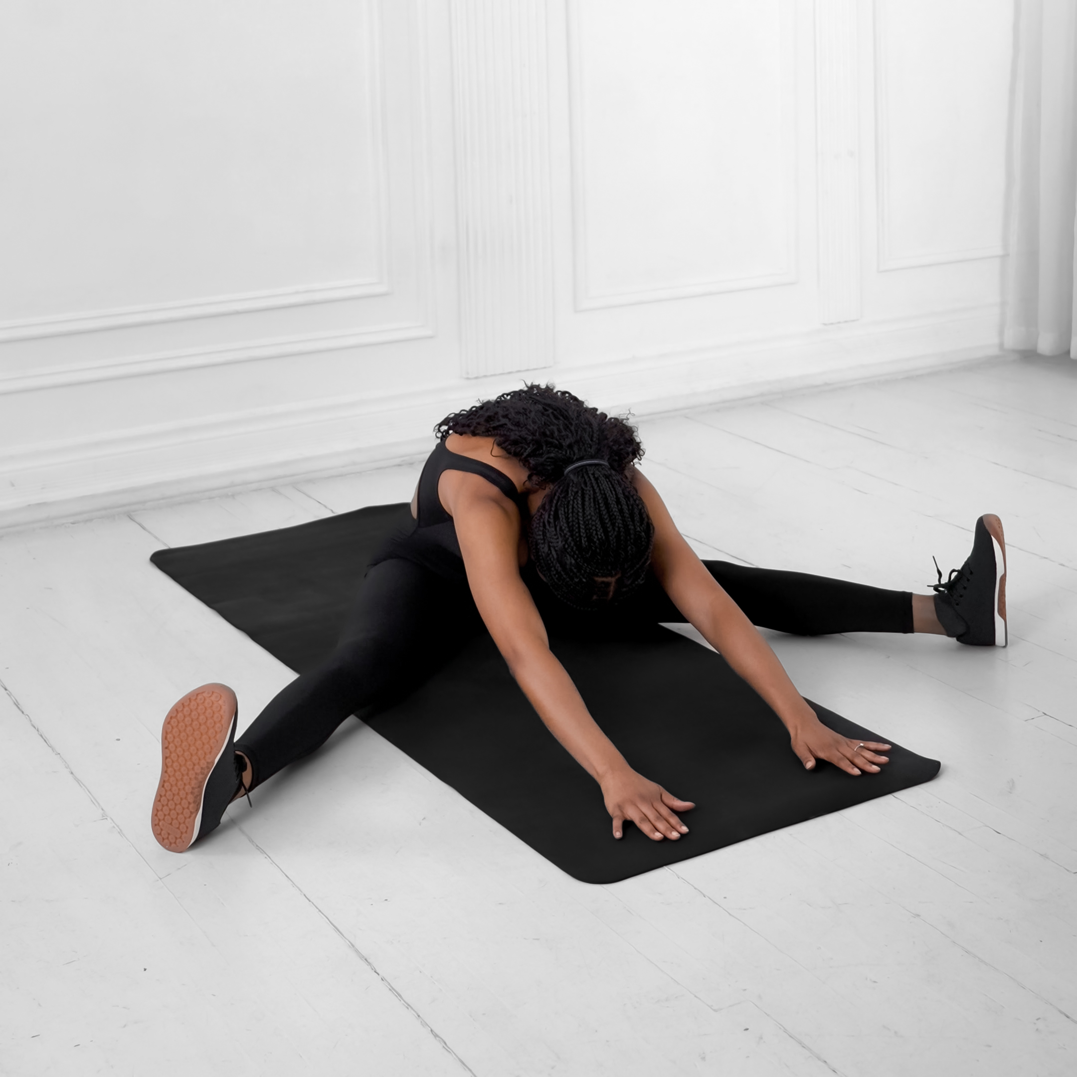 Lower until bent thigh is parallel to ground or as deep as flexibility allows, with straight leg extended and inner thigh stretched, knee aligned over toes.