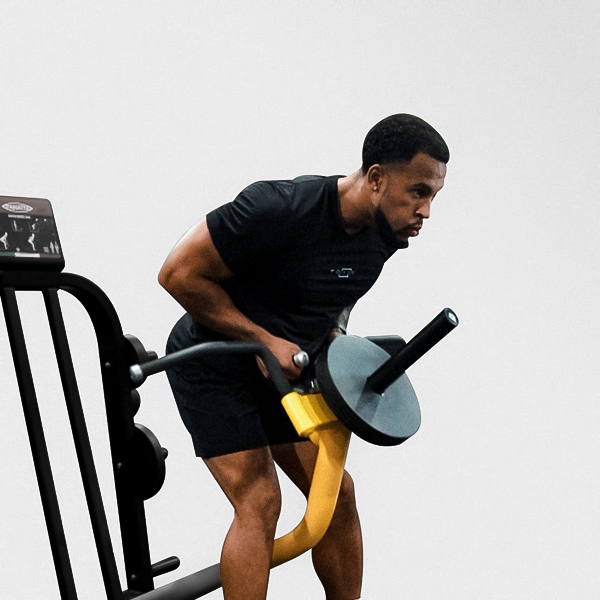Adjust the seat height so the chest pad aligns with your mid-chest. Place feet firmly on the platform and grasp the handles with a neutral grip.