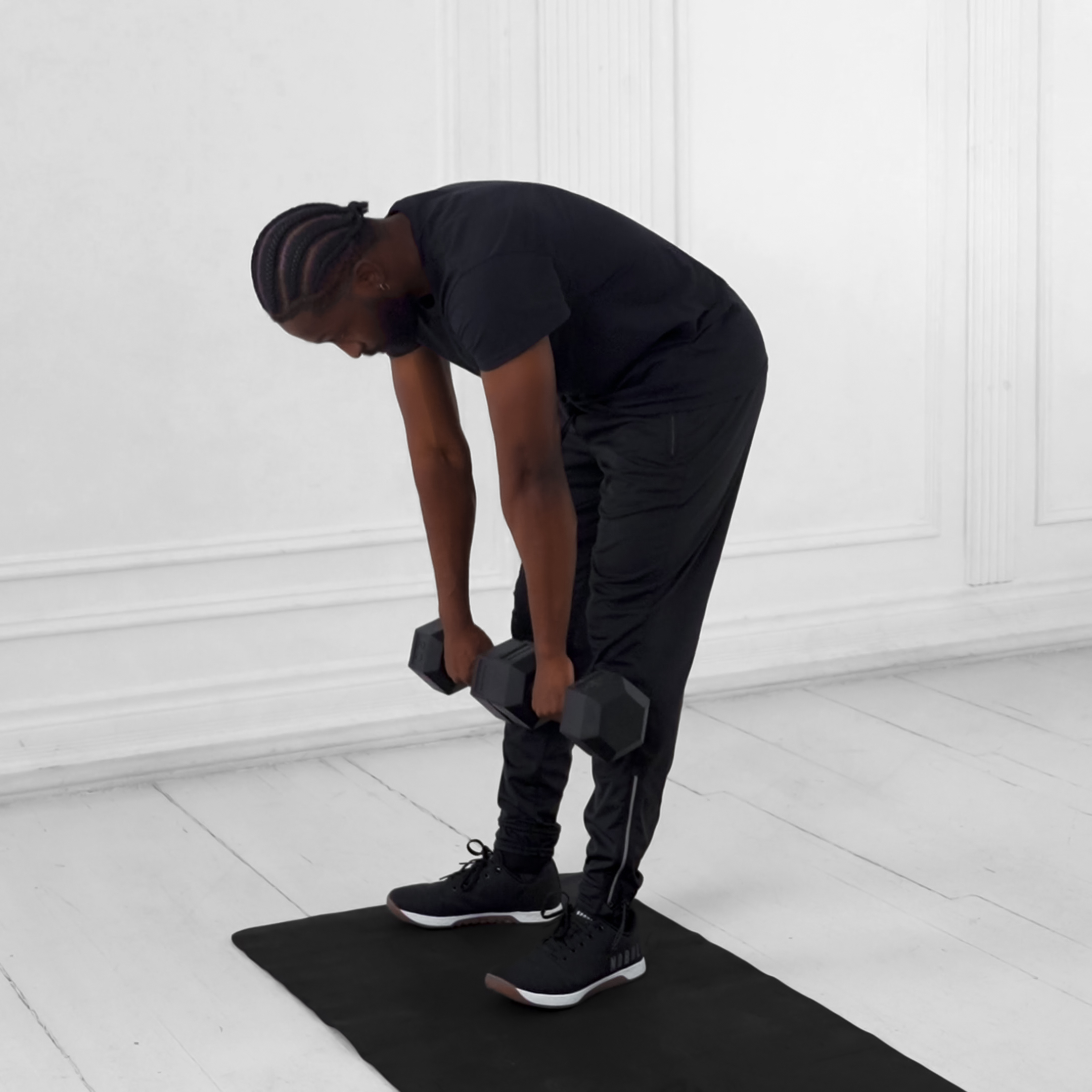 Lean forward until upper body is at 45 degrees from horizontal, extend back until torso is parallel to floor without over-arching lumbar spine.