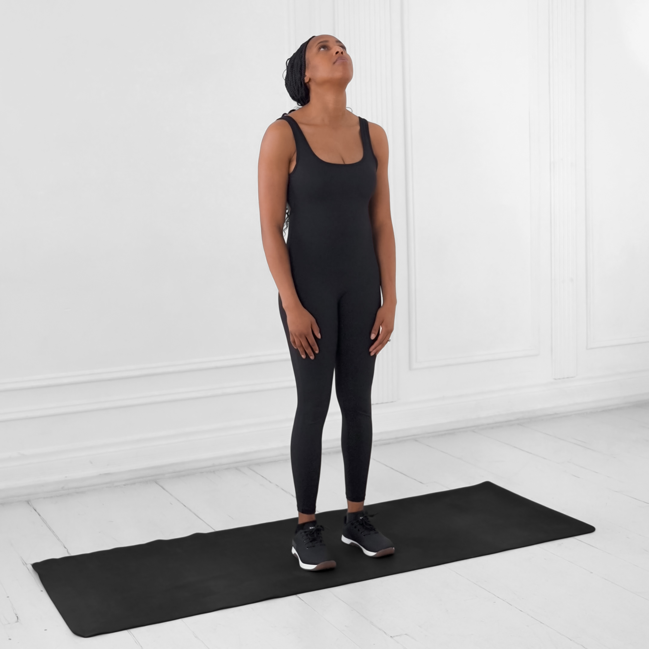Sit tall in a sturdy chair with feet flat on the floor and shoulders relaxed, or stand with good posture.