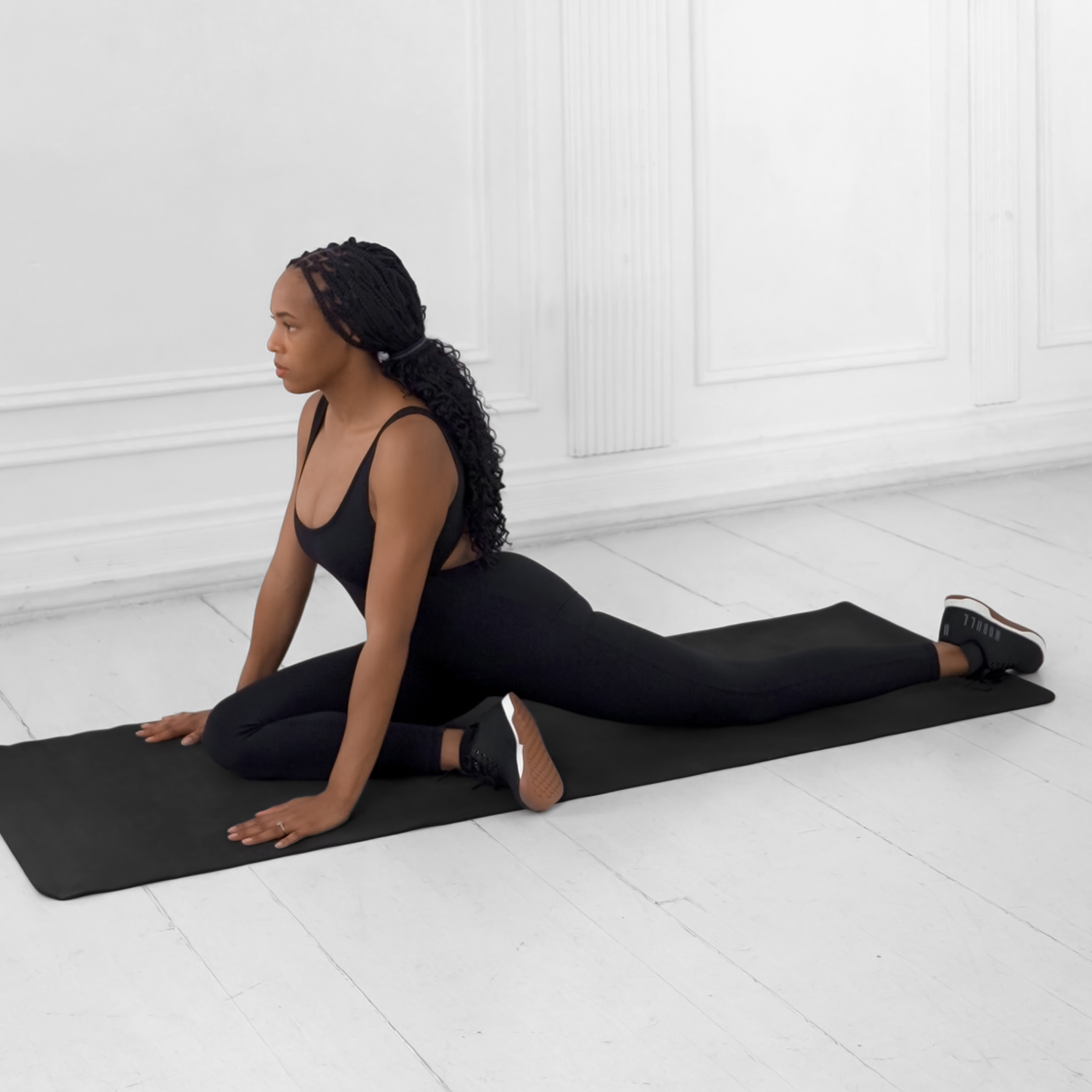 Sit on the floor with right leg in front bent at 90 degrees, shin perpendicular to torso, and left leg to the side bent at 90 degrees, shin parallel to torso. Sit tall with engaged core and hands behind for support if needed.