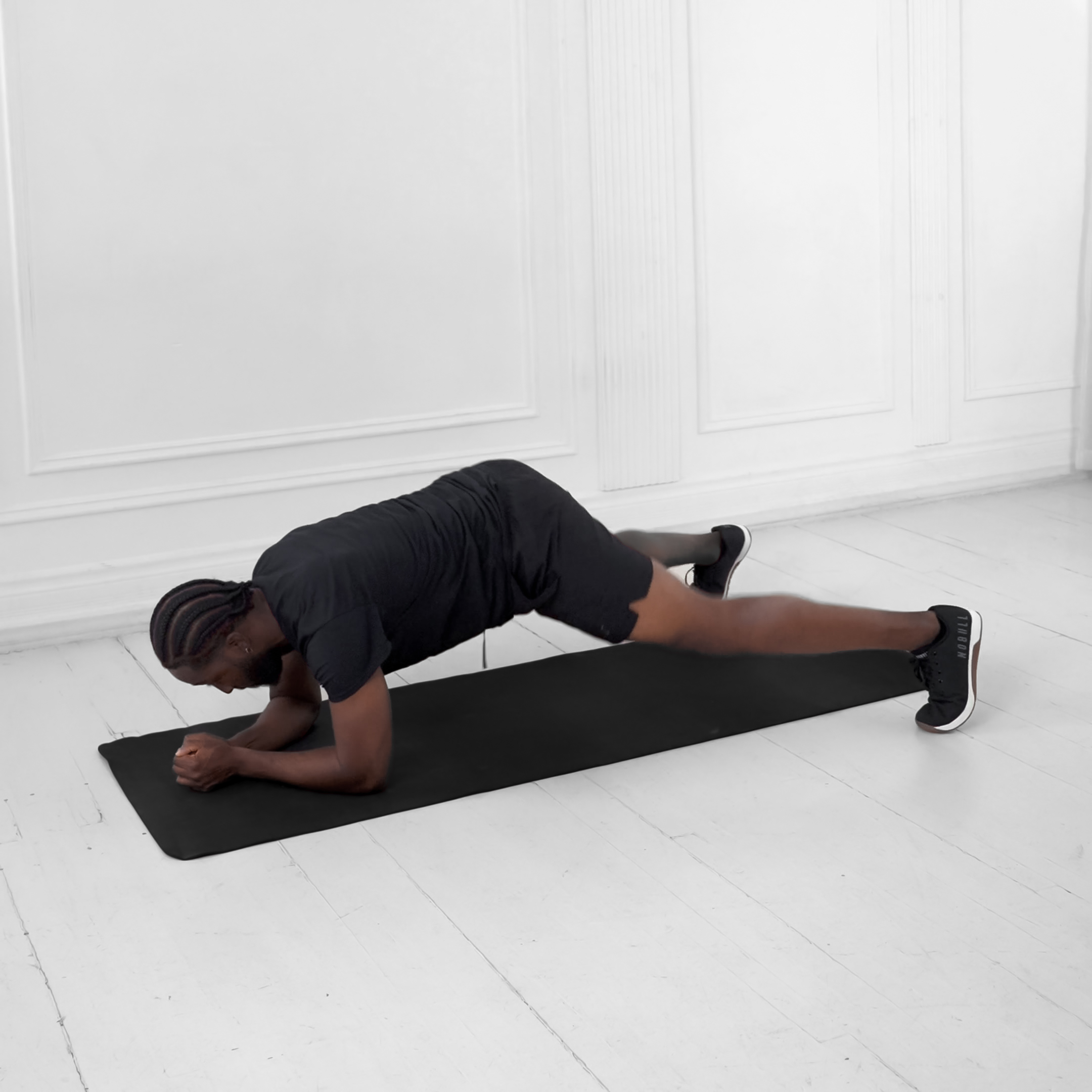 Inhale as you lower down to your forearms, exhale as you push back up to the high plank.