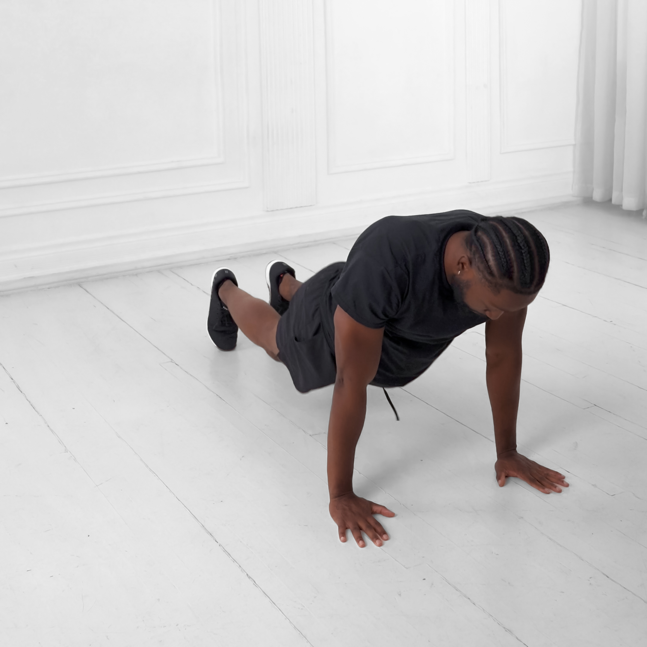 Start in a high plank position with hands under shoulders and feet hip-width apart, creating a straight line from head to heels.