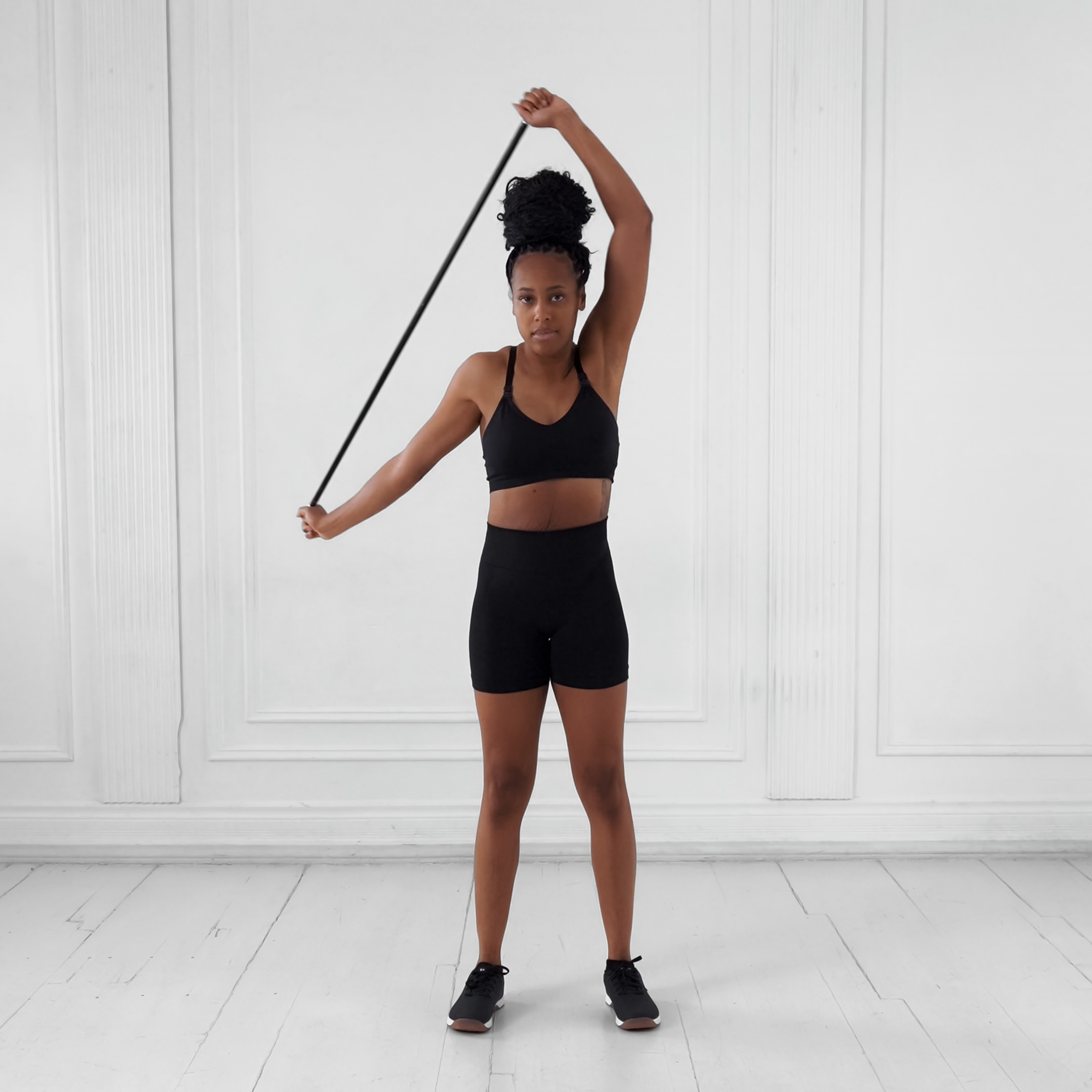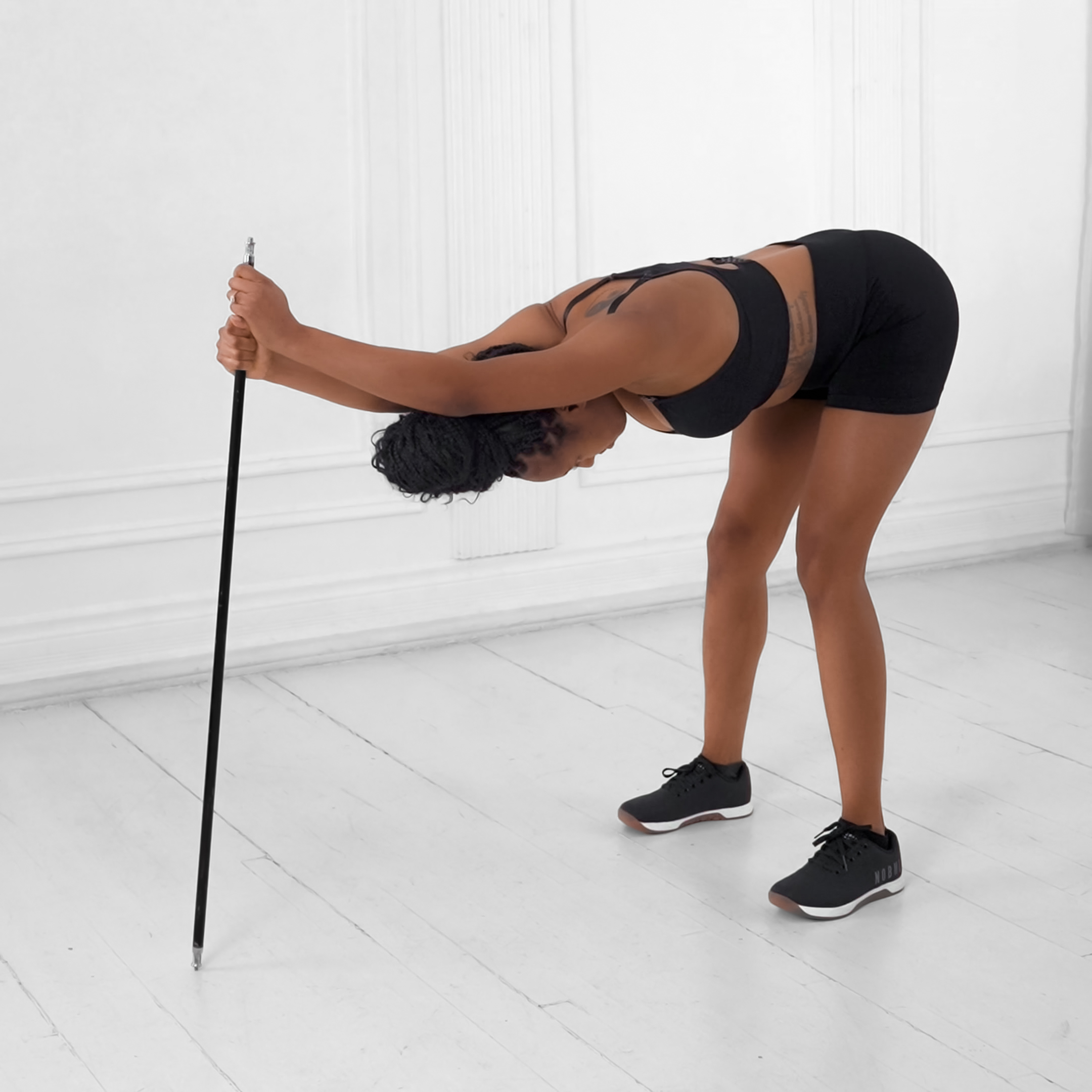 Stand upright holding a PVC pipe with a supinated (underhand) grip just outside shoulder width, keeping elbows tucked near the ribs.
