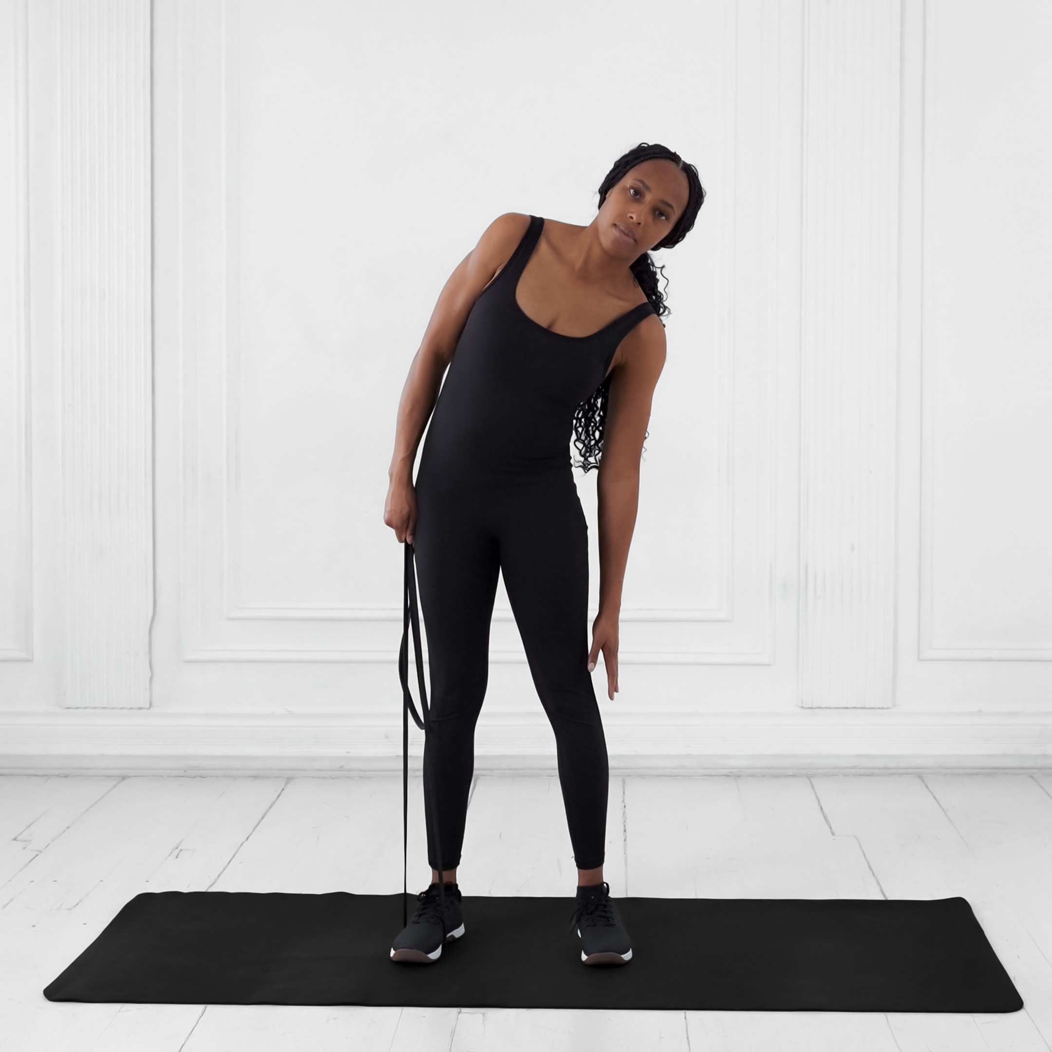 Start in quadruped position on mat with wrists under shoulders and knees under hips, neutral spine. Loop light resistance band around one foot and hold opposite hand to create gentle pull.