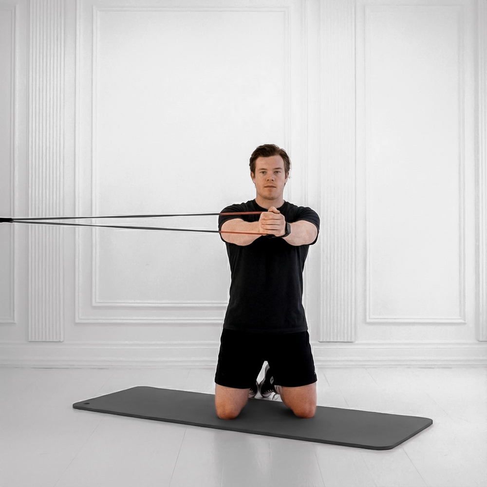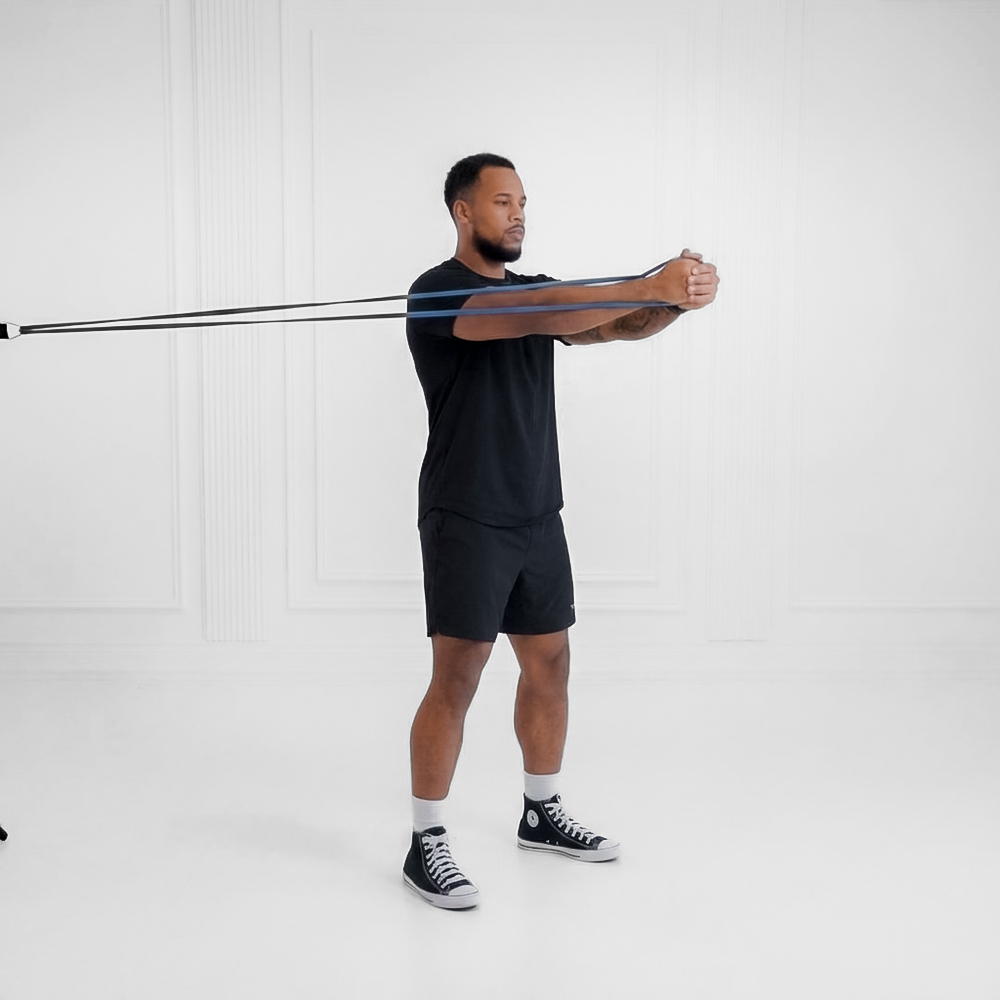 Anchor a resistance band at chest height to a secure point. Stand perpendicular to the anchor, hold the band with both hands at chest center, step away for tension, feet shoulder-width.