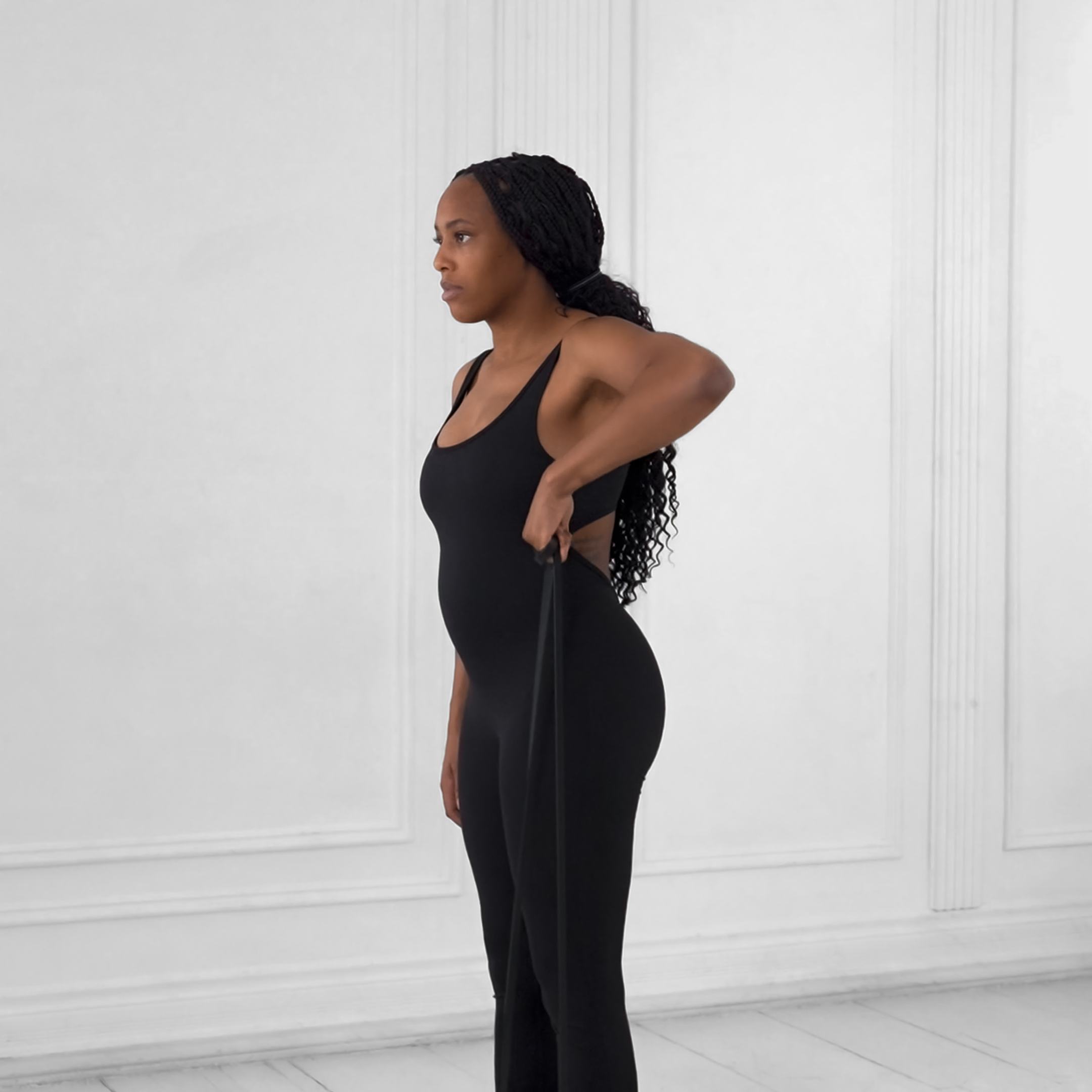 Extend arms fully until straight with tension; pull until elbows are behind torso and hands contact rib cage.