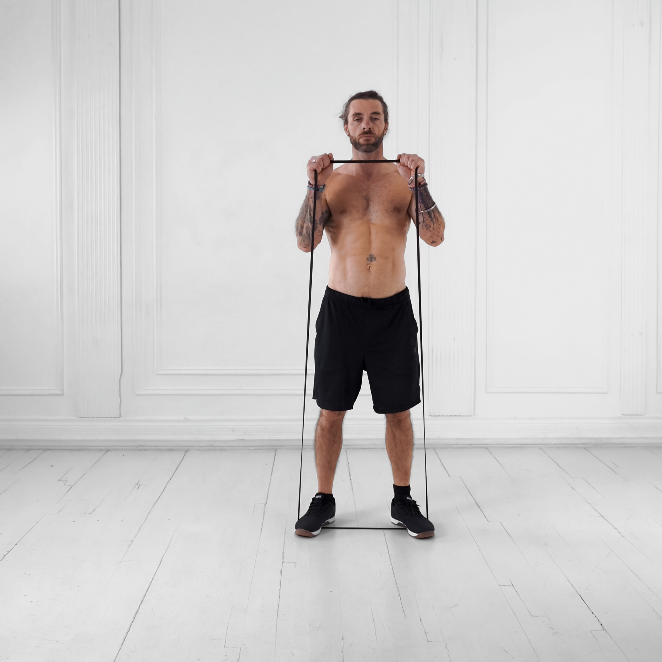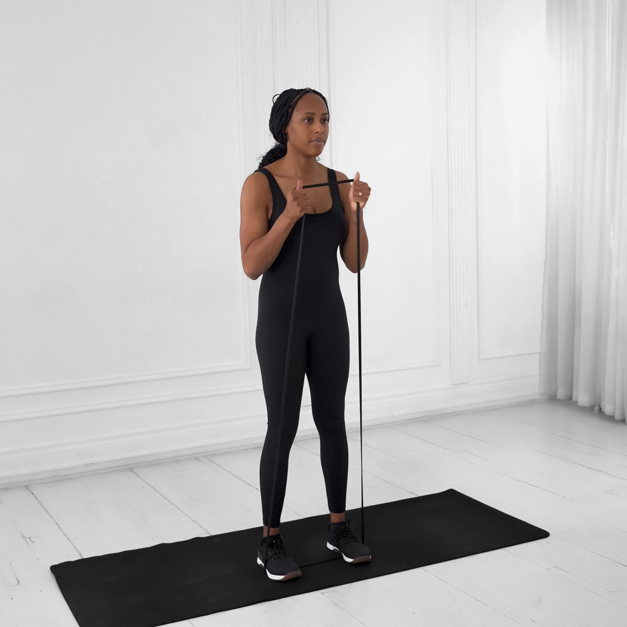 Stand with feet shoulder-width apart, place the middle of the resistance band under one foot, and grasp the end with an underhand grip in one hand, arm extended.