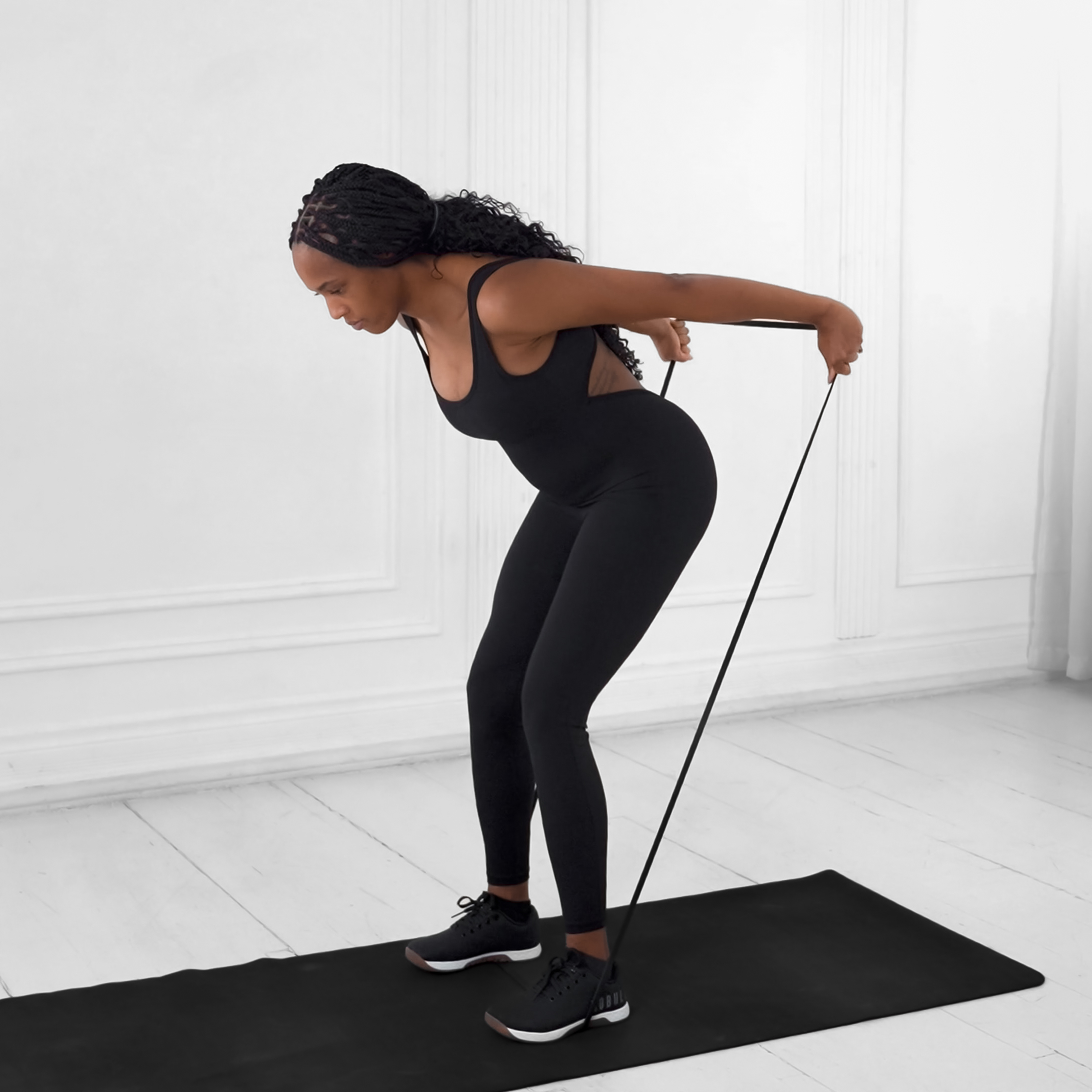 Anchor the resistance band under the foot on the working side. Stand with feet shoulder-width apart, grip the band with one hand using an underhand grip, and raise your arm overhead with elbow bent and close to your head.