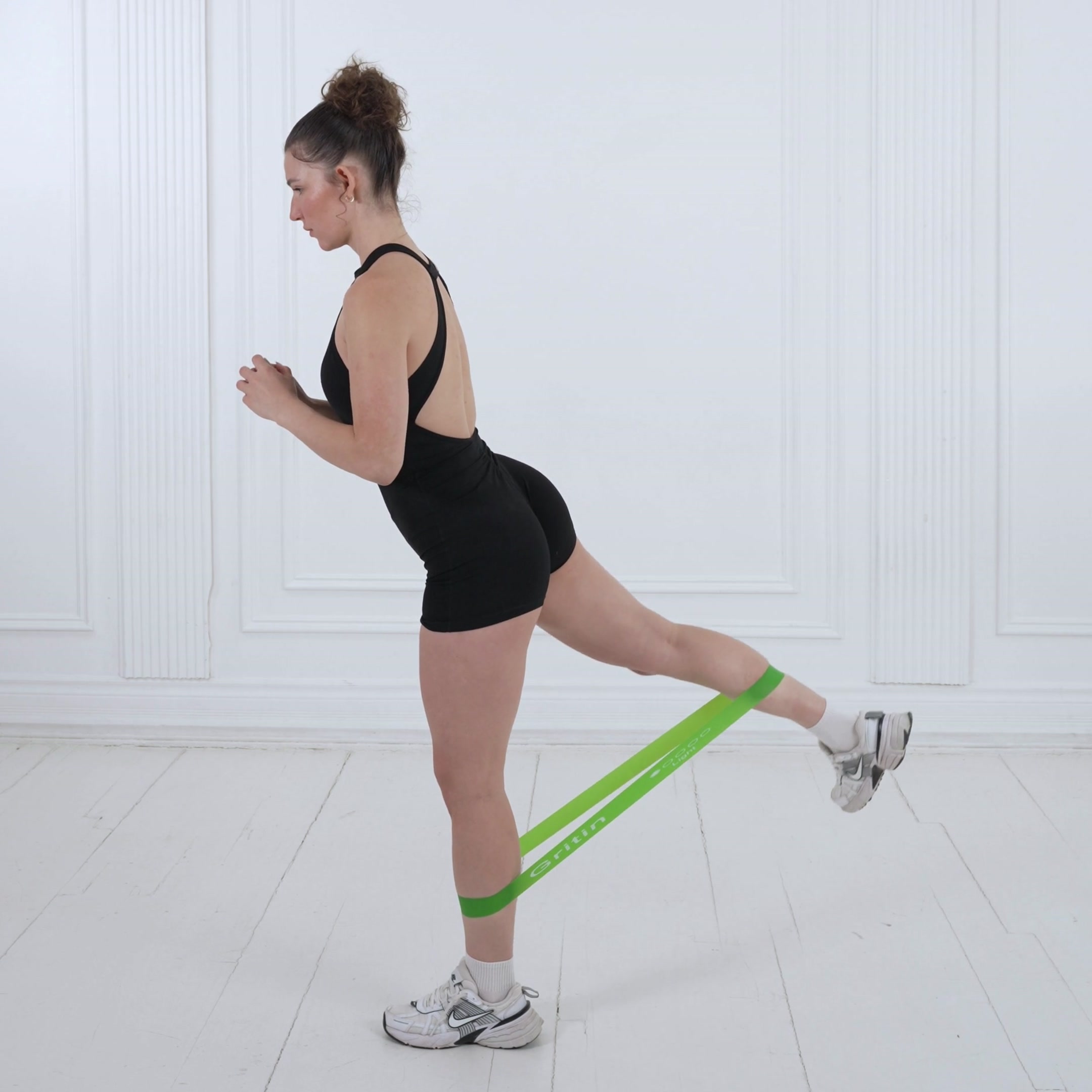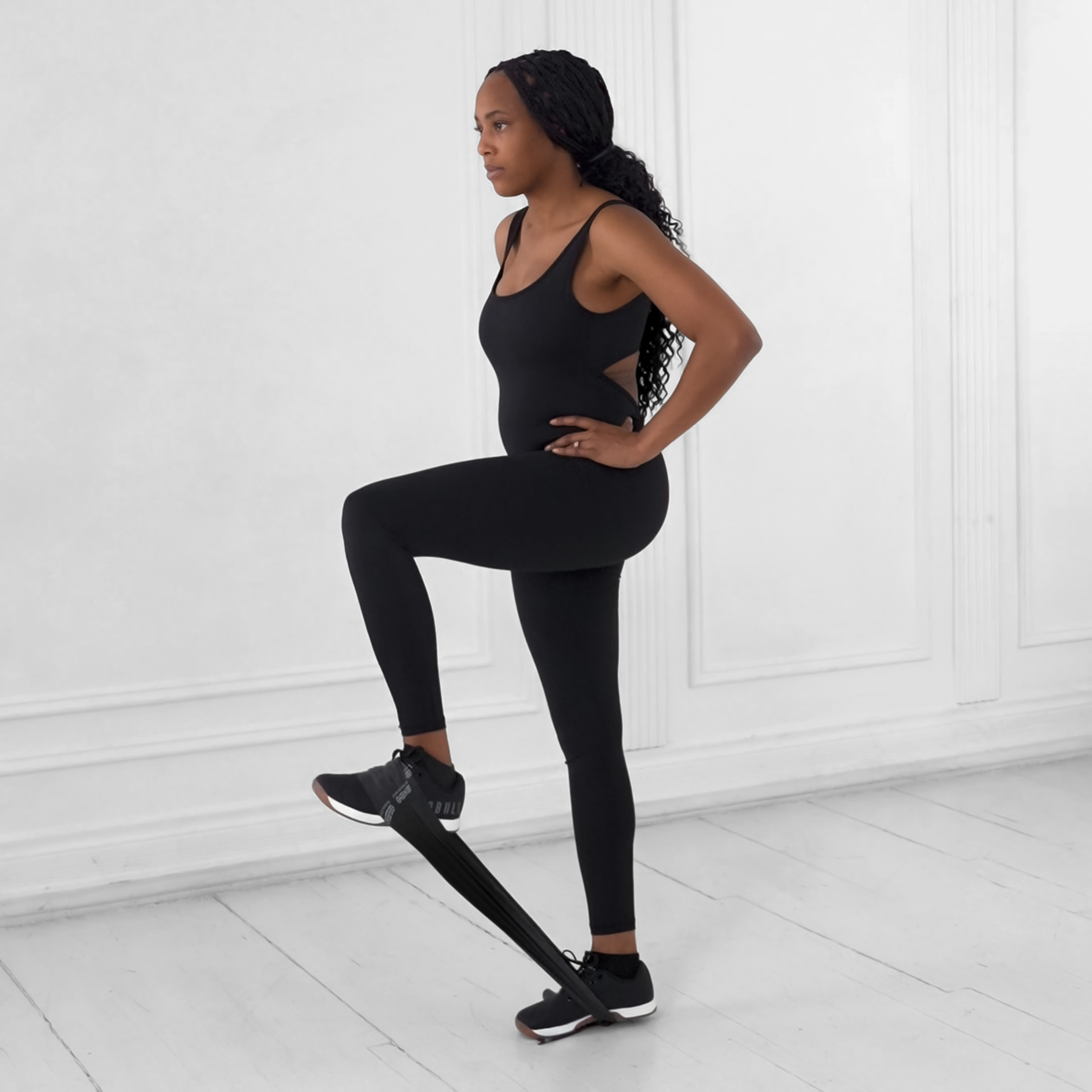 Place a loop resistance band just above your knees and position a sturdy platform in front of you at knee height. Stand facing the platform with feet hip-width apart, core engaged.