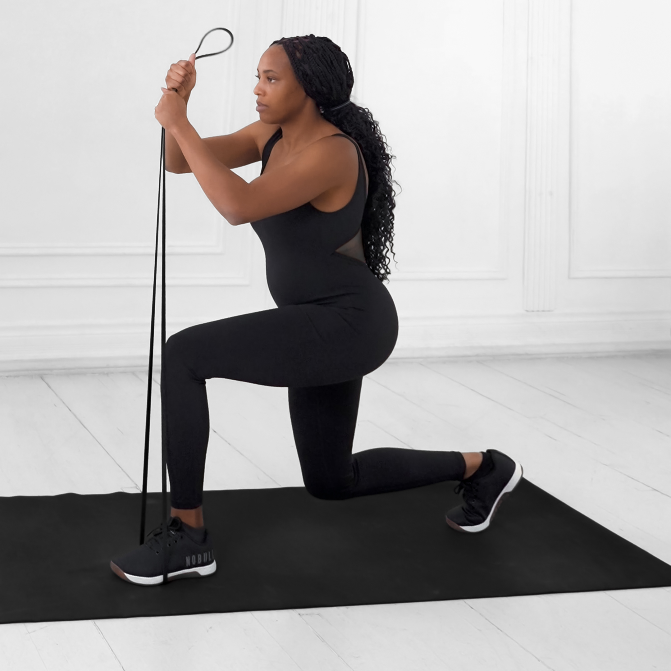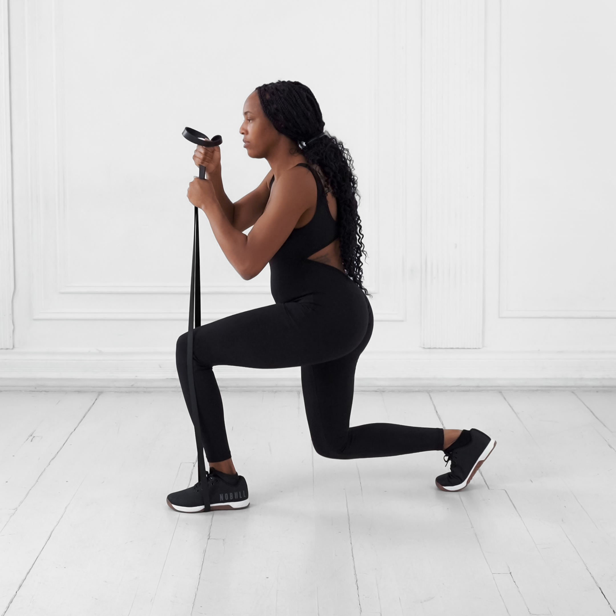 A resistance band step-up onto a platform that targets glutes and quads to build lower body strength, balance, and conditioning; provides variable resistance for increased muscle activation.