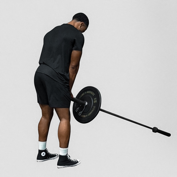 Start with bar on floor, shins touching; ascend to full hip and knee extension with shoulders back and bar over mid-foot.