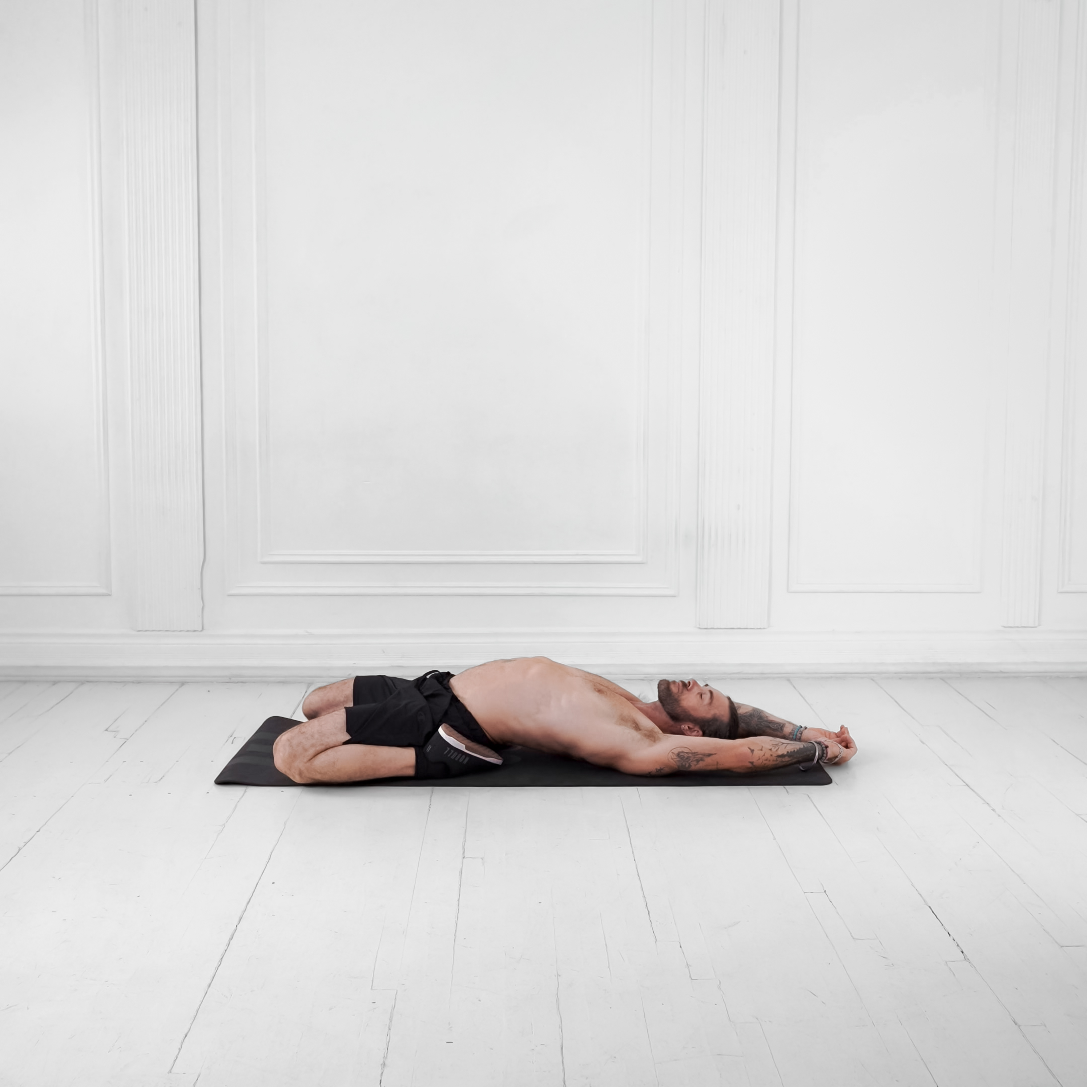 A deep, static Yin Yoga stretch that targets the quadriceps and hip flexors by reclining the torso while sitting between the feet. Used to improve lower body mobility and stimulate connective tissue.