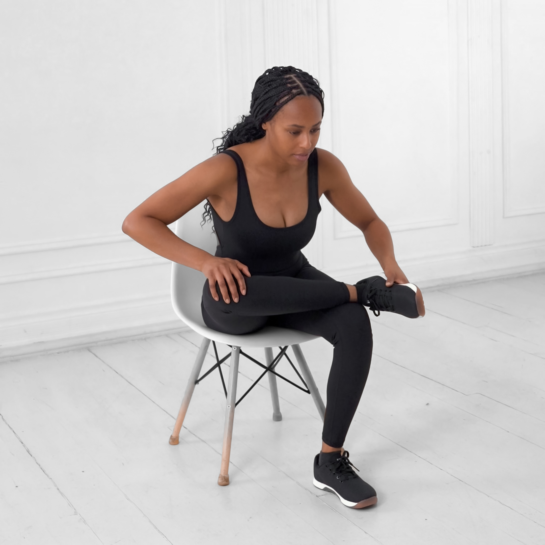 Sit upright on the edge of a chair or floor with feet flat and back straight. Cross one ankle over the opposite knee to form a figure-4 shape.
