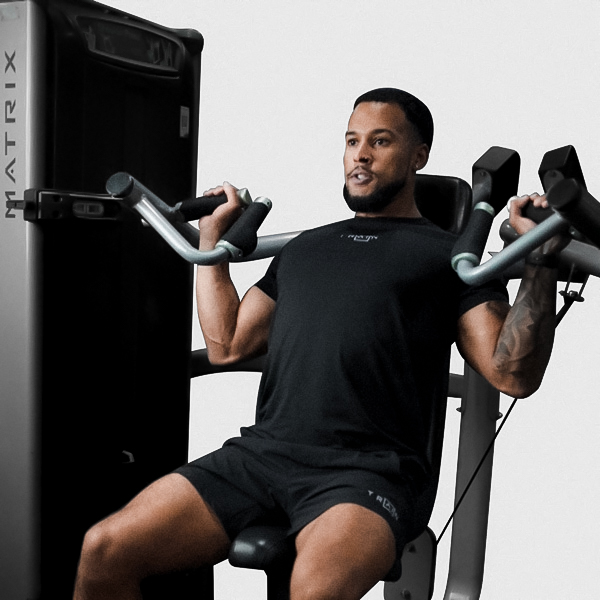 Adjust seat so handles align with shoulders, elbows at 90 degrees. Sit with back against pad, feet flat, grip handles neutrally with palms facing each other.