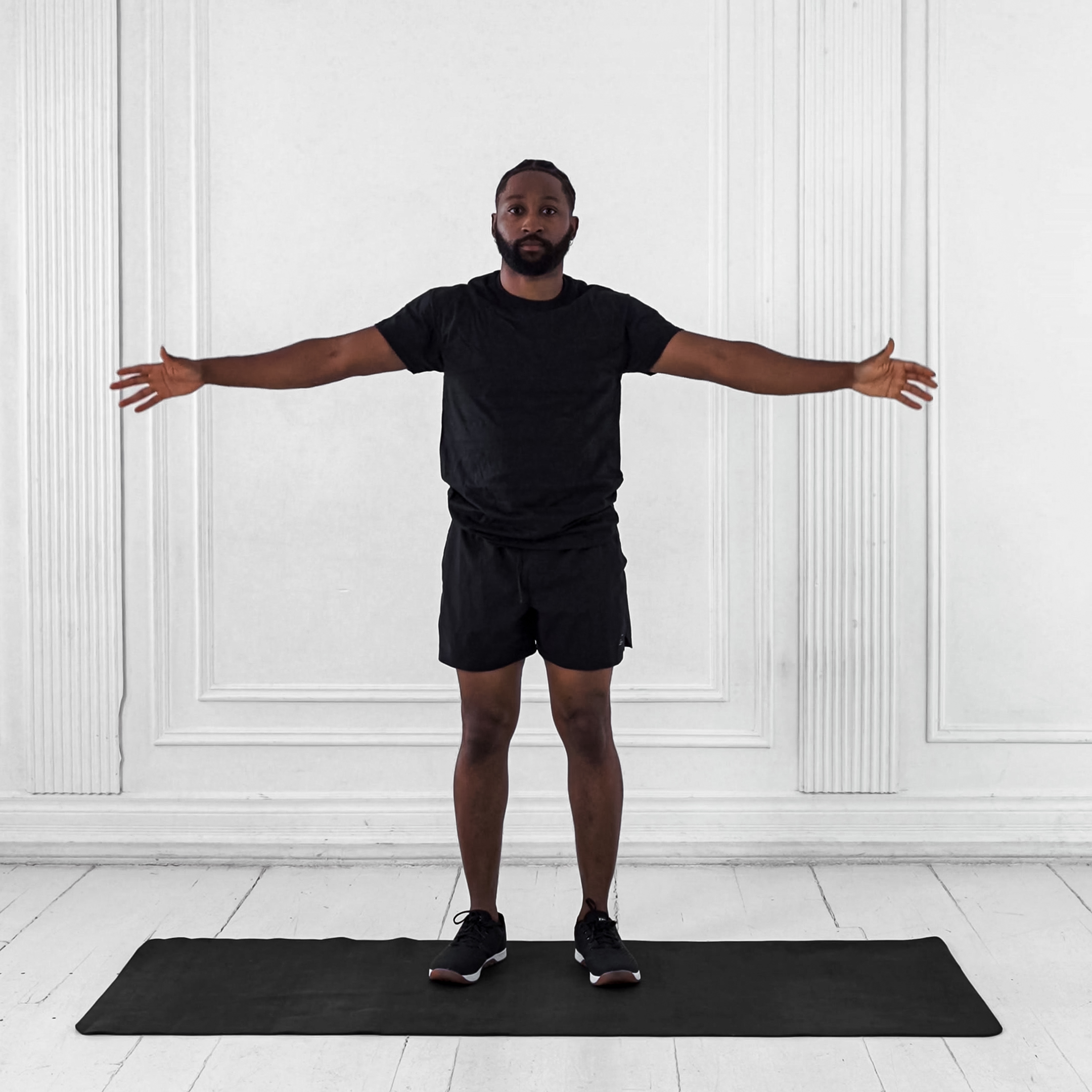 Stand tall with feet shoulder-width apart, arms relaxed at sides, or sit upright. Maintain neutral head and neck position.