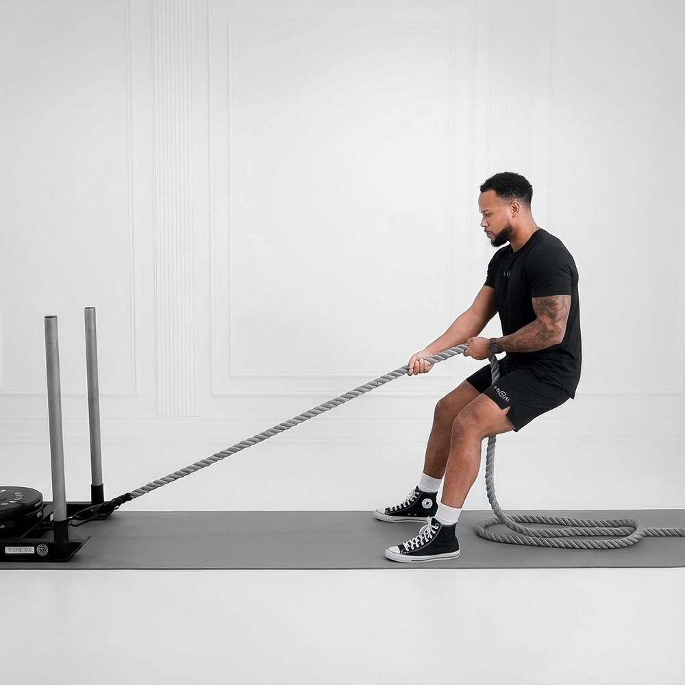 Weighted sled pull across a surface that targets quads, glutes, and hamstrings to build strength, power, and conditioning; low-impact with minimal eccentric loading for reduced soreness.