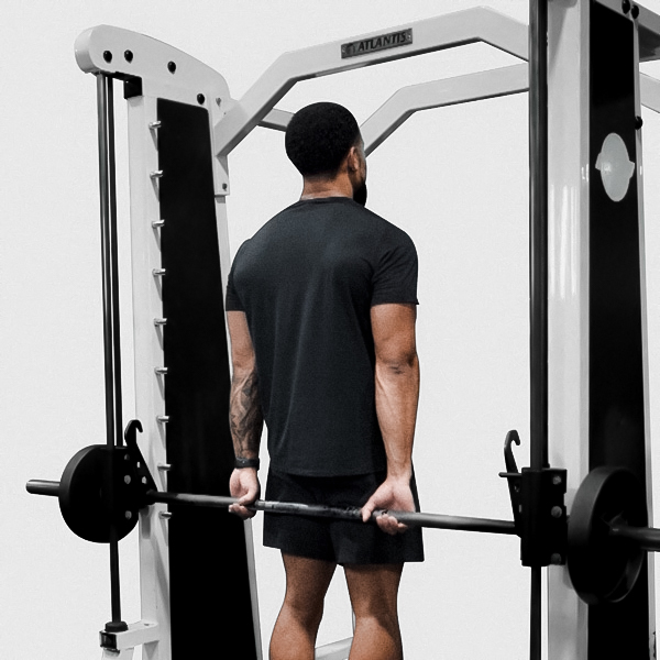 Set the bar to mid-thigh height. Stand facing away from the machine, holding the bar behind your back with a shoulder-width, palms-facing-back grip.