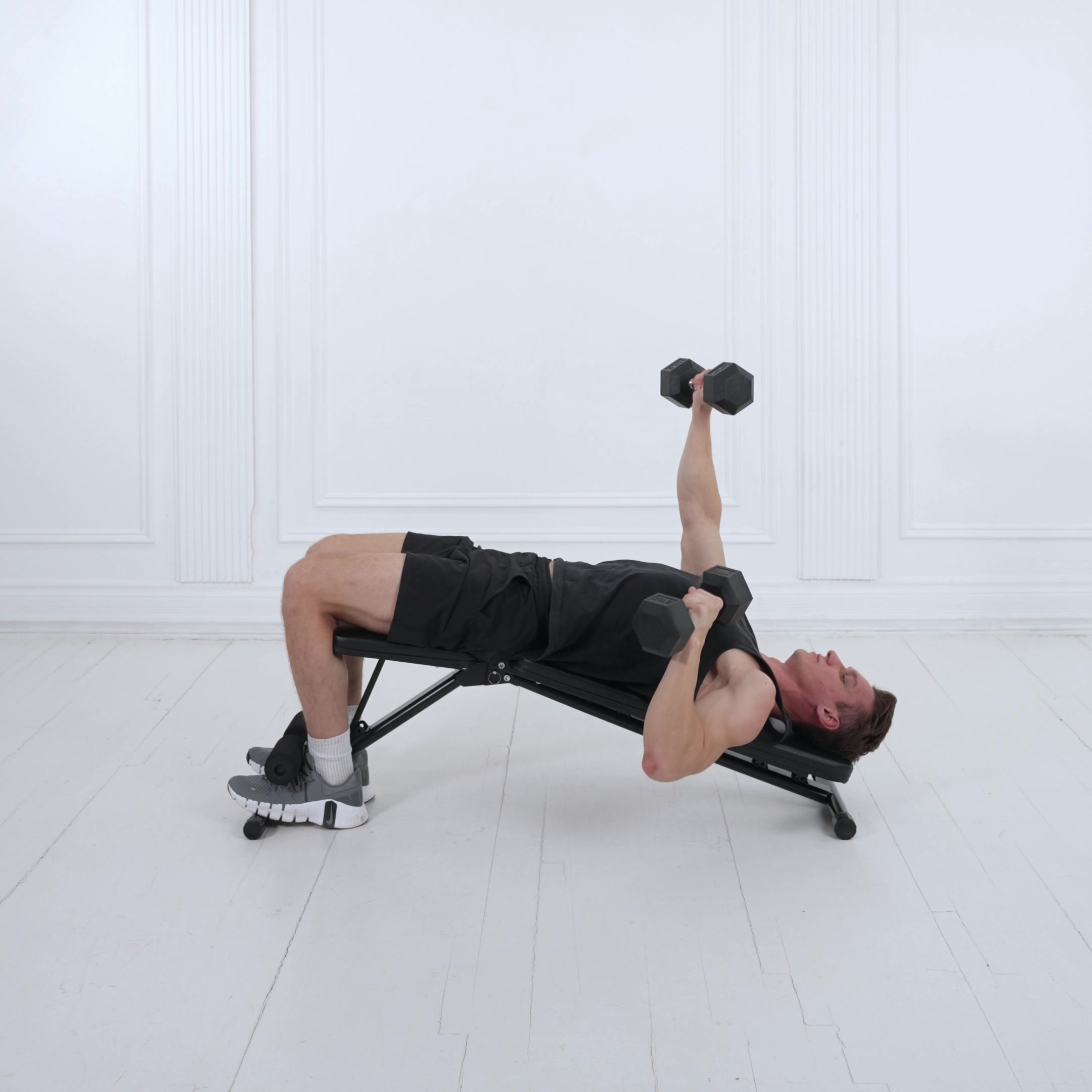 Inhale as you lower each dumbbell, exhale as you press up; brace core throughout.