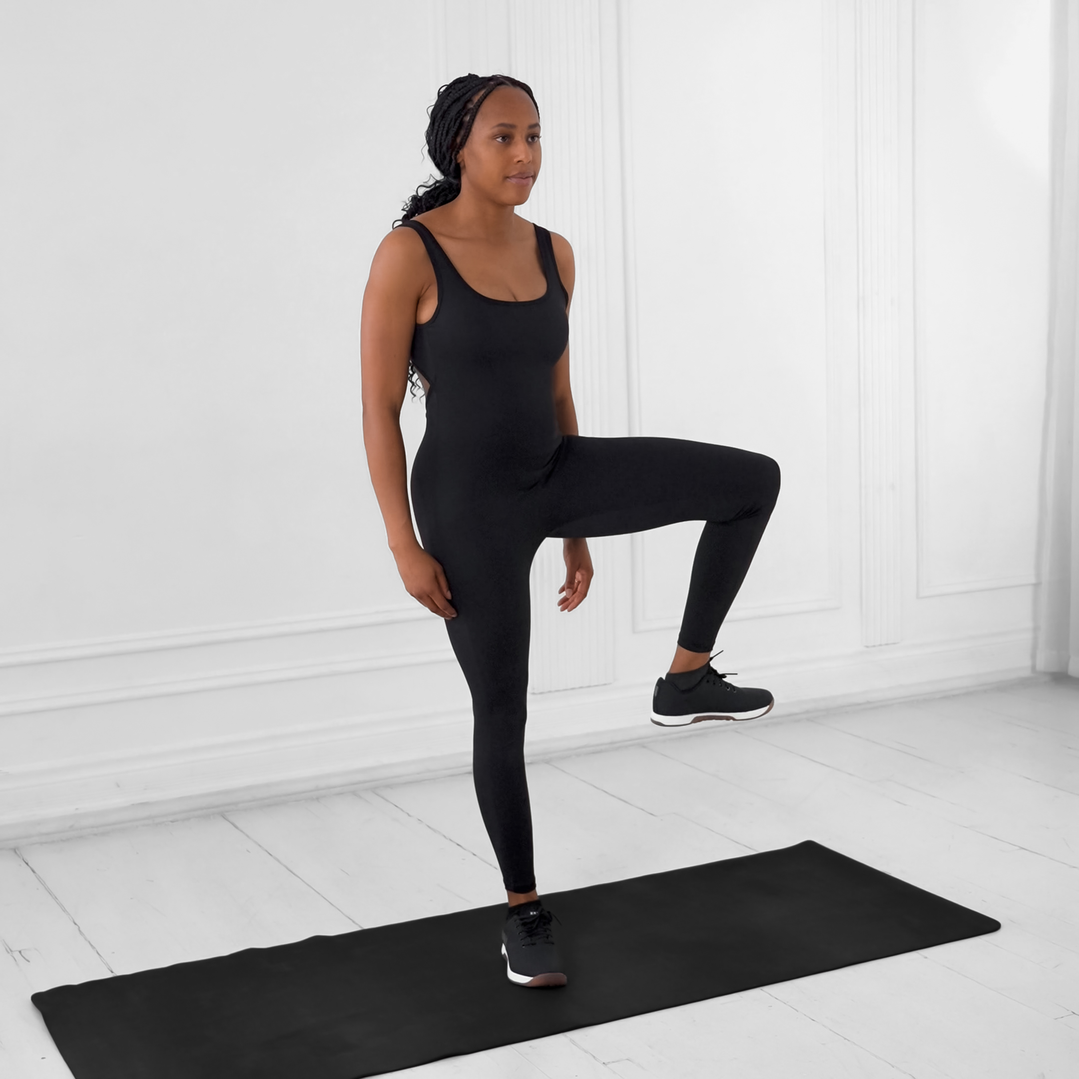 A bodyweight stretch that targets the quadriceps to improve flexibility and reduce tightness in the front thigh; commonly used post-workout for recovery, mobility, and injury prevention.
