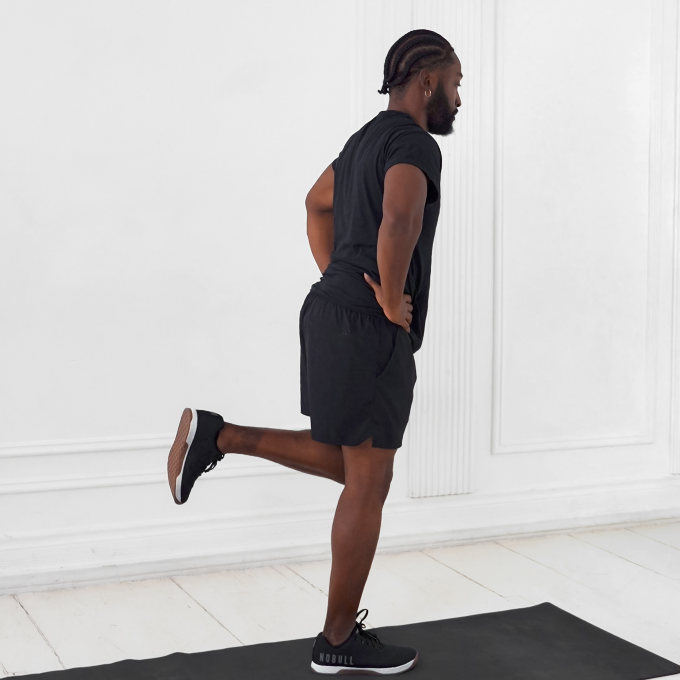 Hinge until you feel mild stretch in hamstrings, with elevated leg straight but knee slightly unlocked, and spine neutral from hips to head.