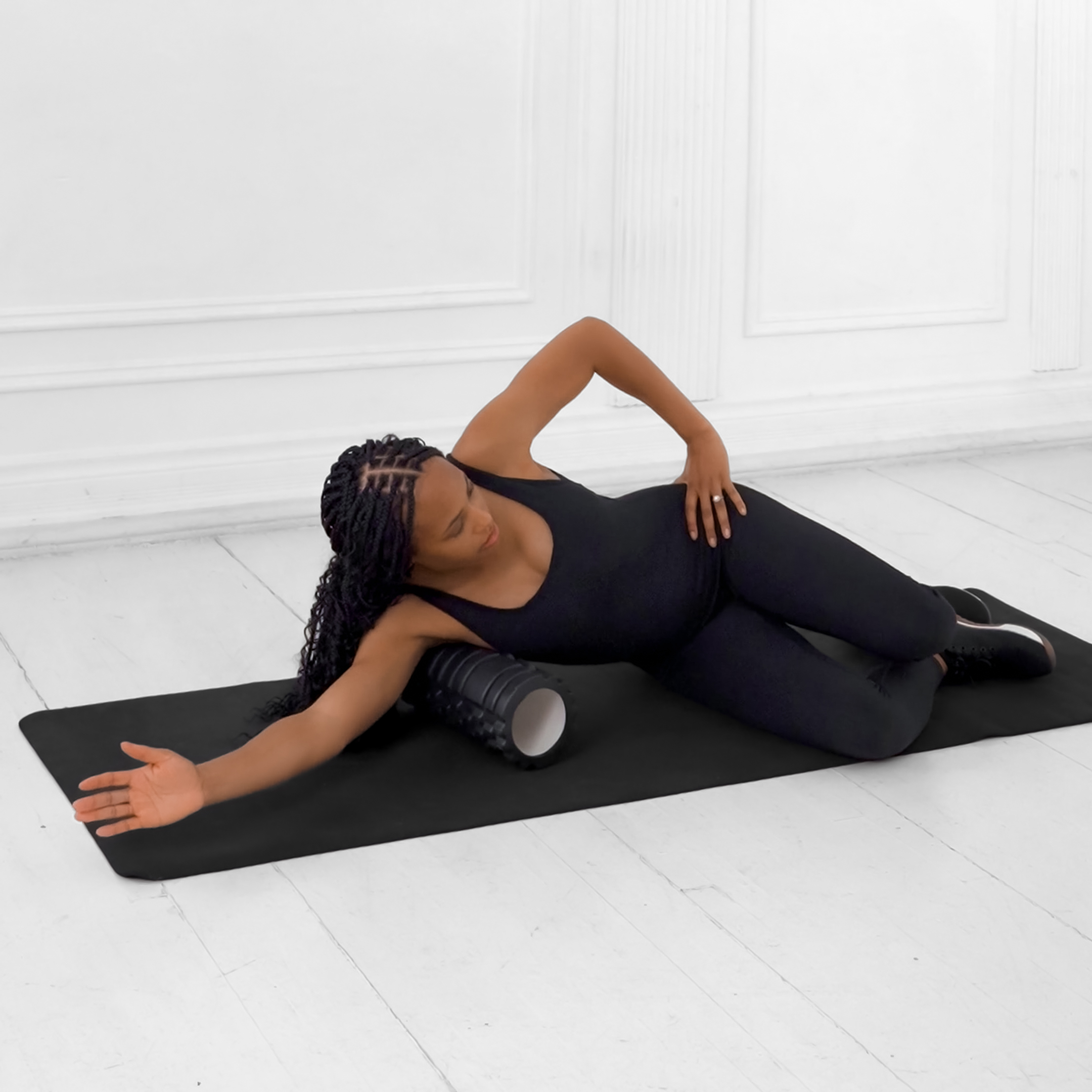 A supine stretch that targets latissimus dorsi to improve shoulder flexion and posture; performed lying on back with arms overhead while engaging core.