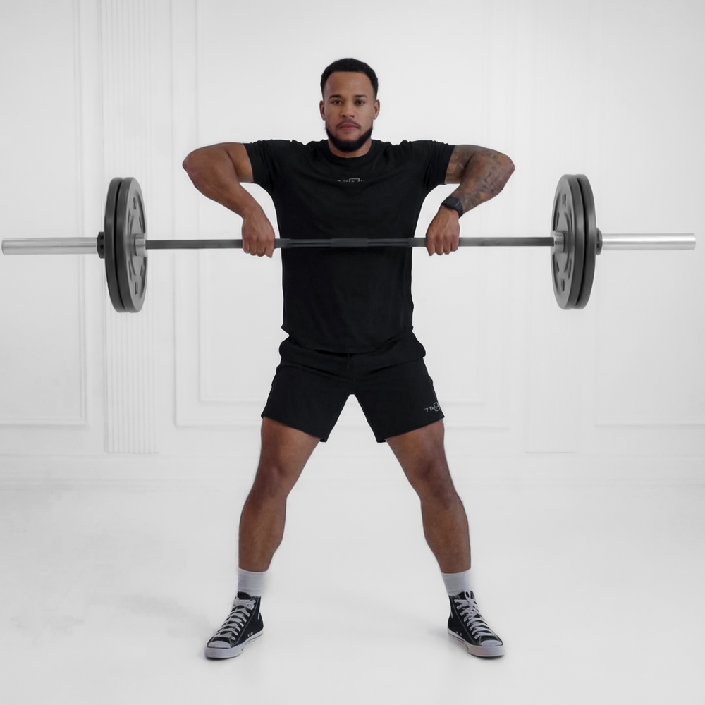 Load equal weight plates on both sides of the trap bar and place it flat on the floor. Step inside the hexagonal frame with feet hip-width apart, toes slightly out.