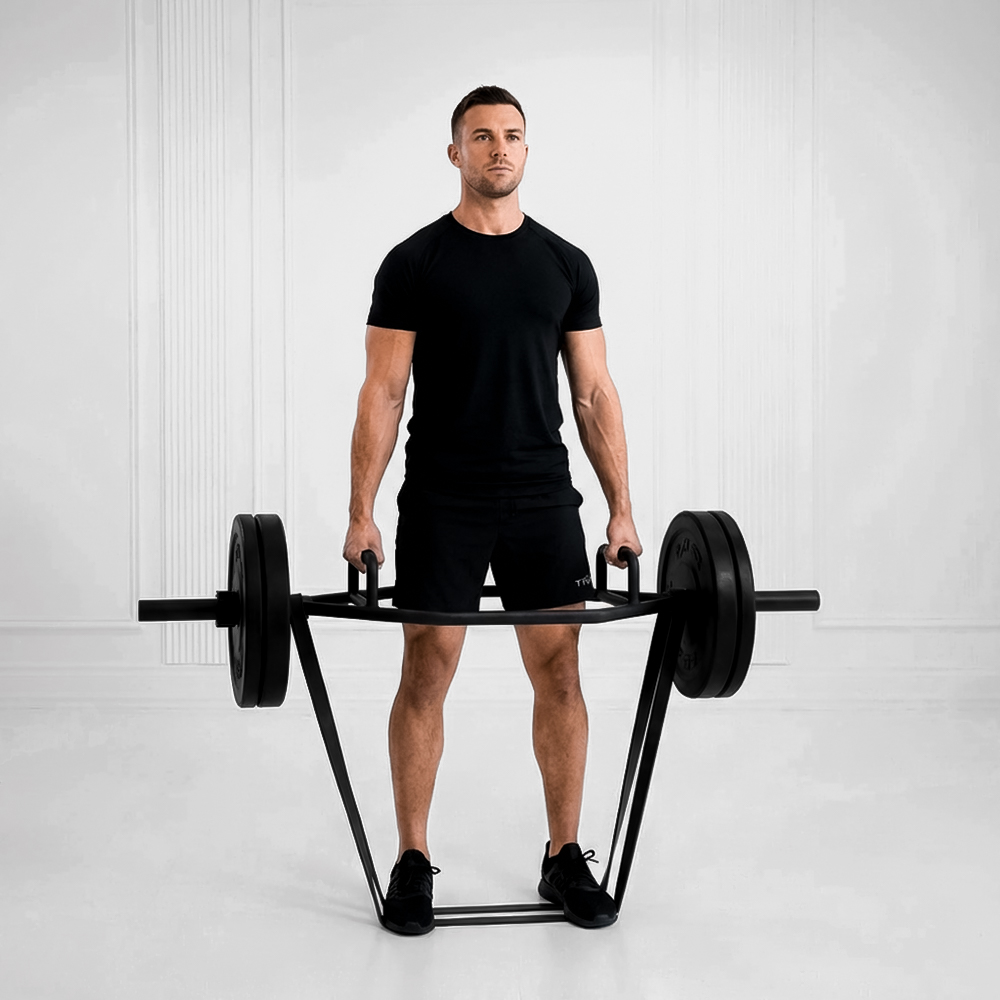 A compound lift using a hexagonal trap bar to pull weight from the floor, targeting quads, glutes, and hamstrings for building strength, power, and muscle; emphasizes upright posture to reduce lower back stress.