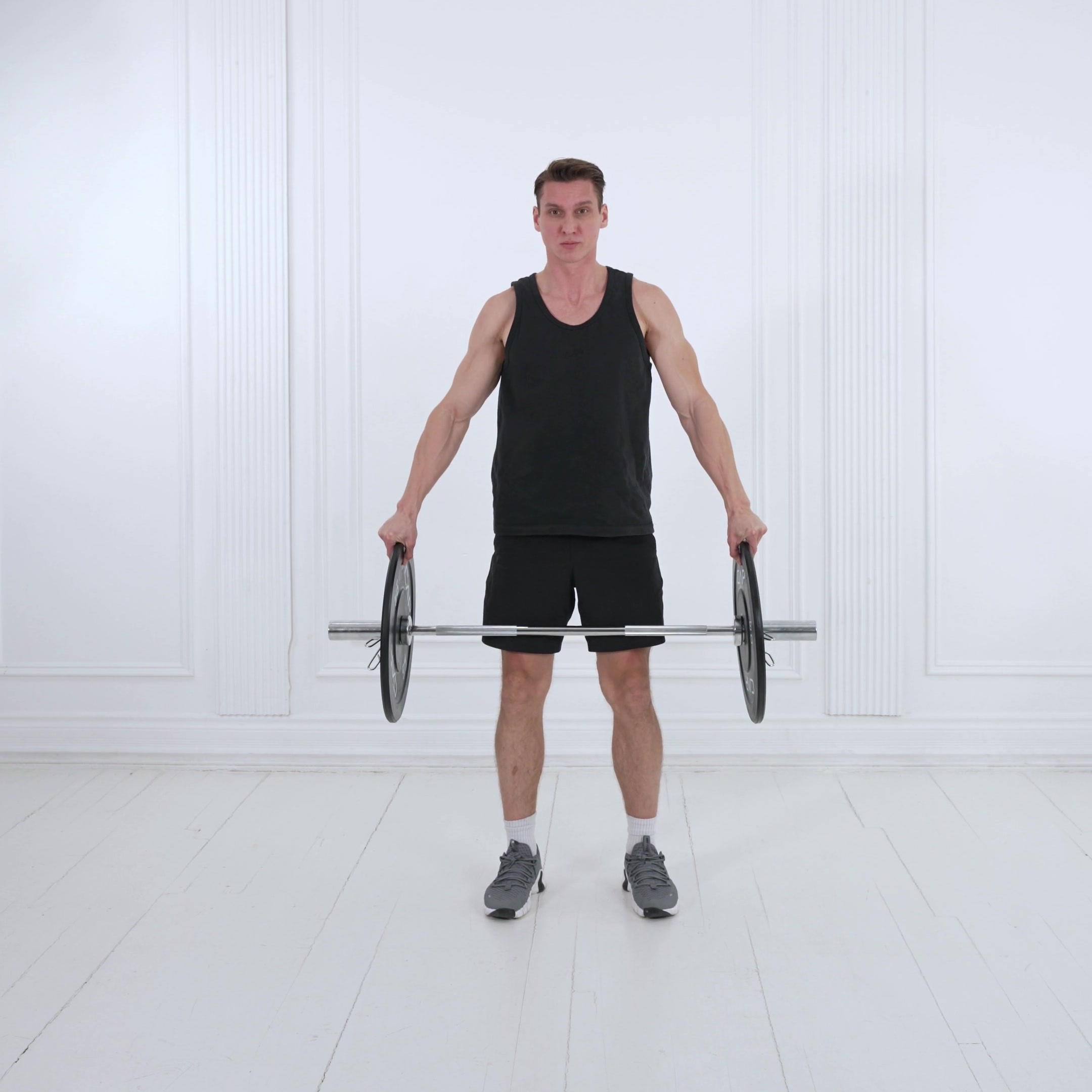 Start with hips below shoulders, shins near bar, neutral spine; lift to full hip/knee extension without back hyperextension; lower until plates touch floor.