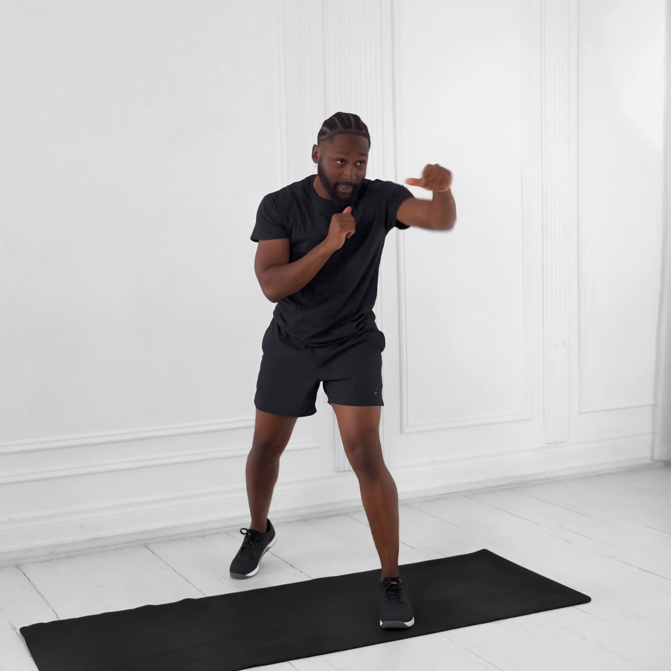 Stand with feet wide apart, about 3-4 feet, on a yoga mat. Turn front foot out 90 degrees and back foot in 15-45 degrees, aligning front heel with back arch.
