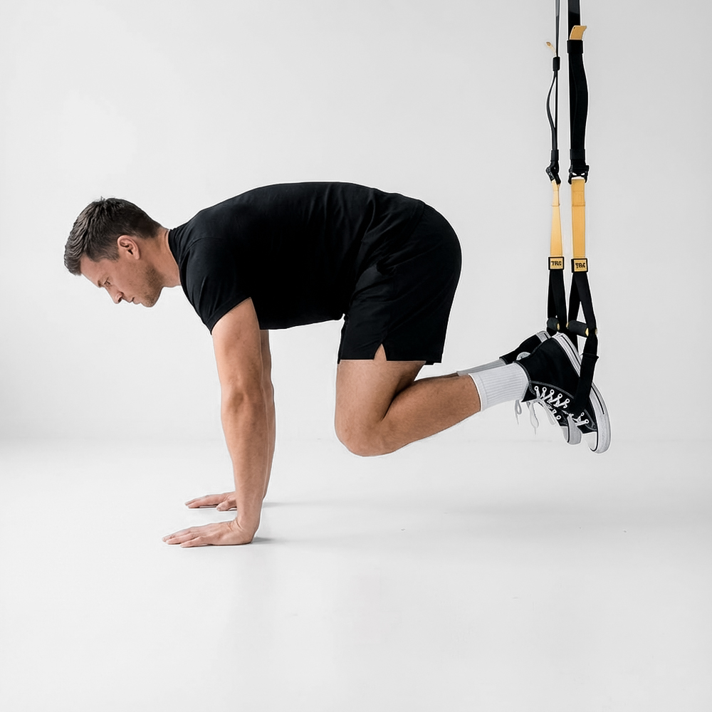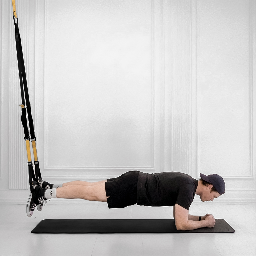 Adjust the suspension trainer straps to mid-calf height. Place your feet in the cradles and assume a plank position on your hands with your body in a straight line.