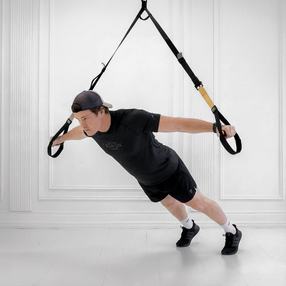 A suspension trainer exercise isolating scapular protraction and retraction to target the serratus anterior and rhomboids for improved shoulder stability and posture.