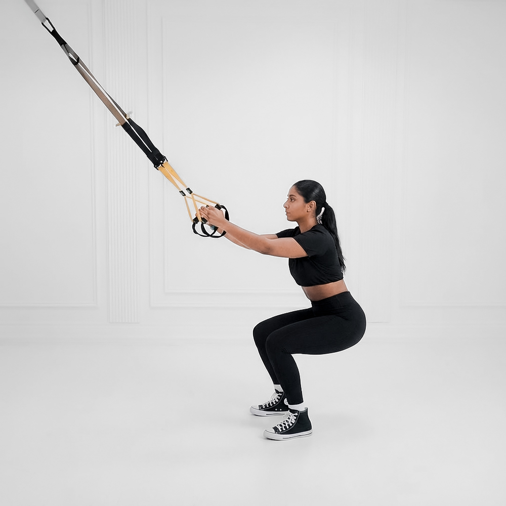 Suspension trainer squat that targets quads and glutes to build lower body strength and stability; commonly used as a regression for standard squats to improve form.