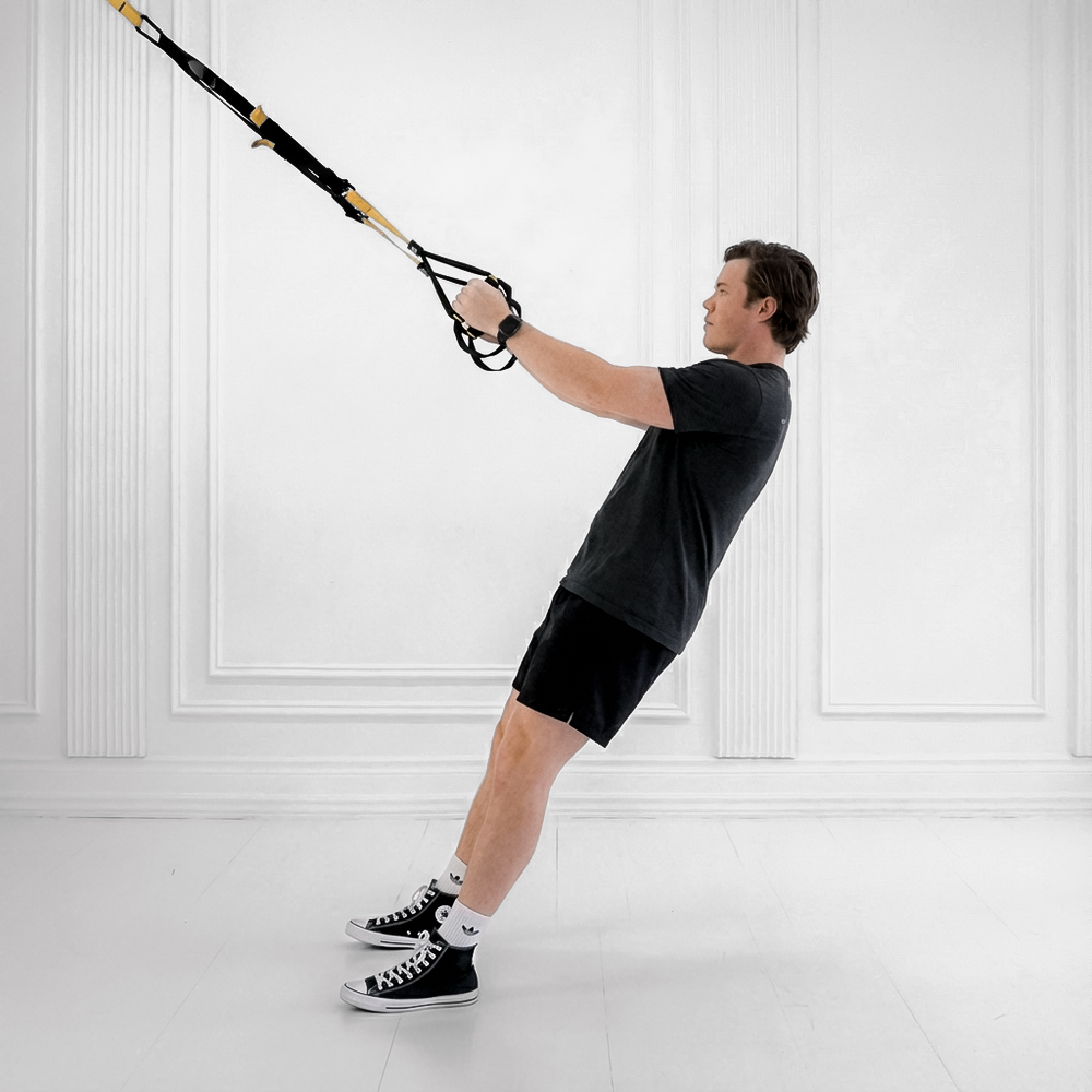 Hold the suspension handles with a neutral grip, arms fully extended, and lean back into a plank position with feet shoulder-width apart facing the anchor point.