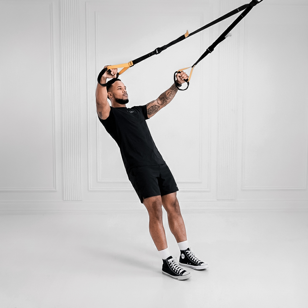 Anchor straps at a mid-to-high point. Hold handles with palms facing inward, lean back with arms extended forward, and align body in a straight plank.