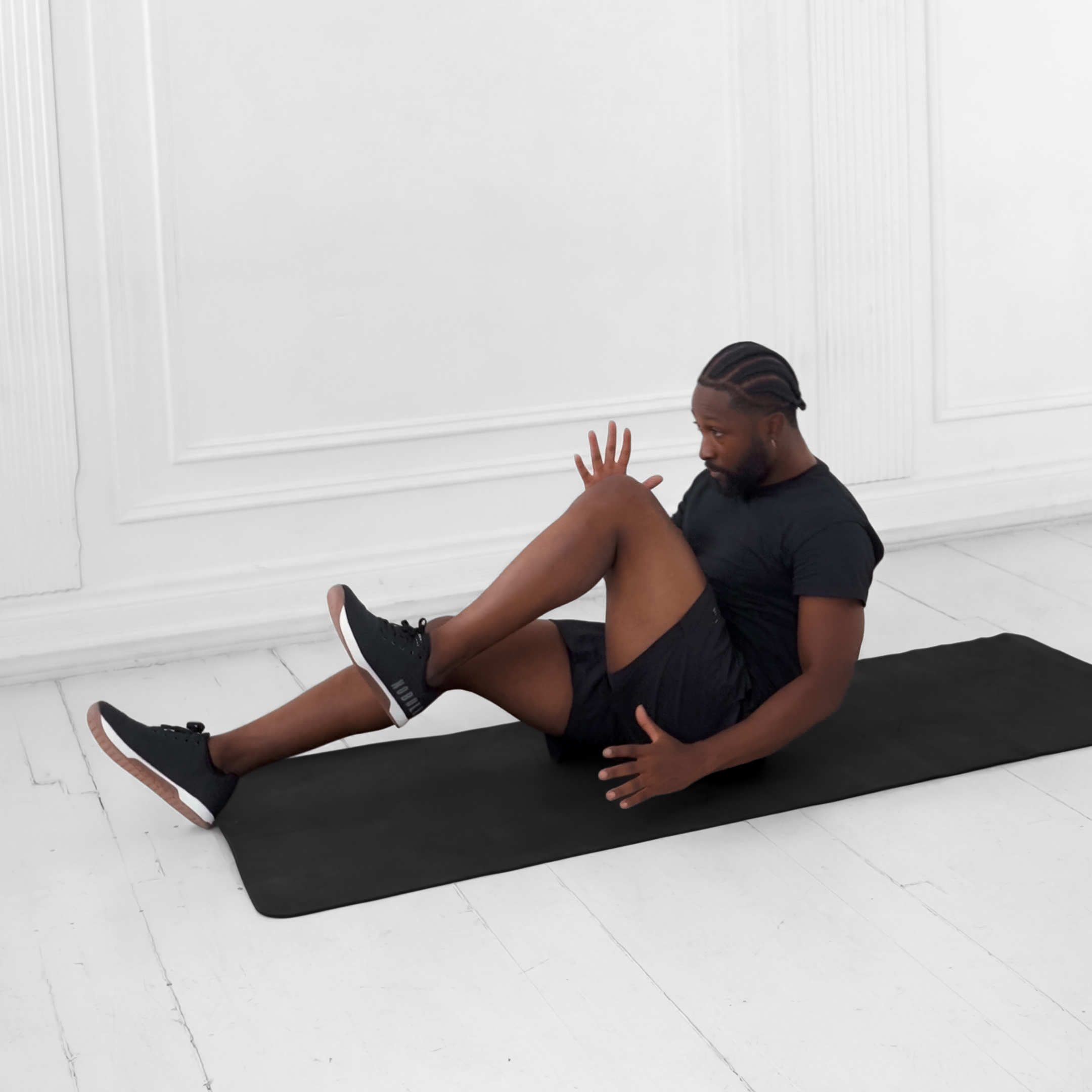 Sit on the floor with legs extended straight in front and hands beside hips for support. Engage core and lean back slightly to prepare.